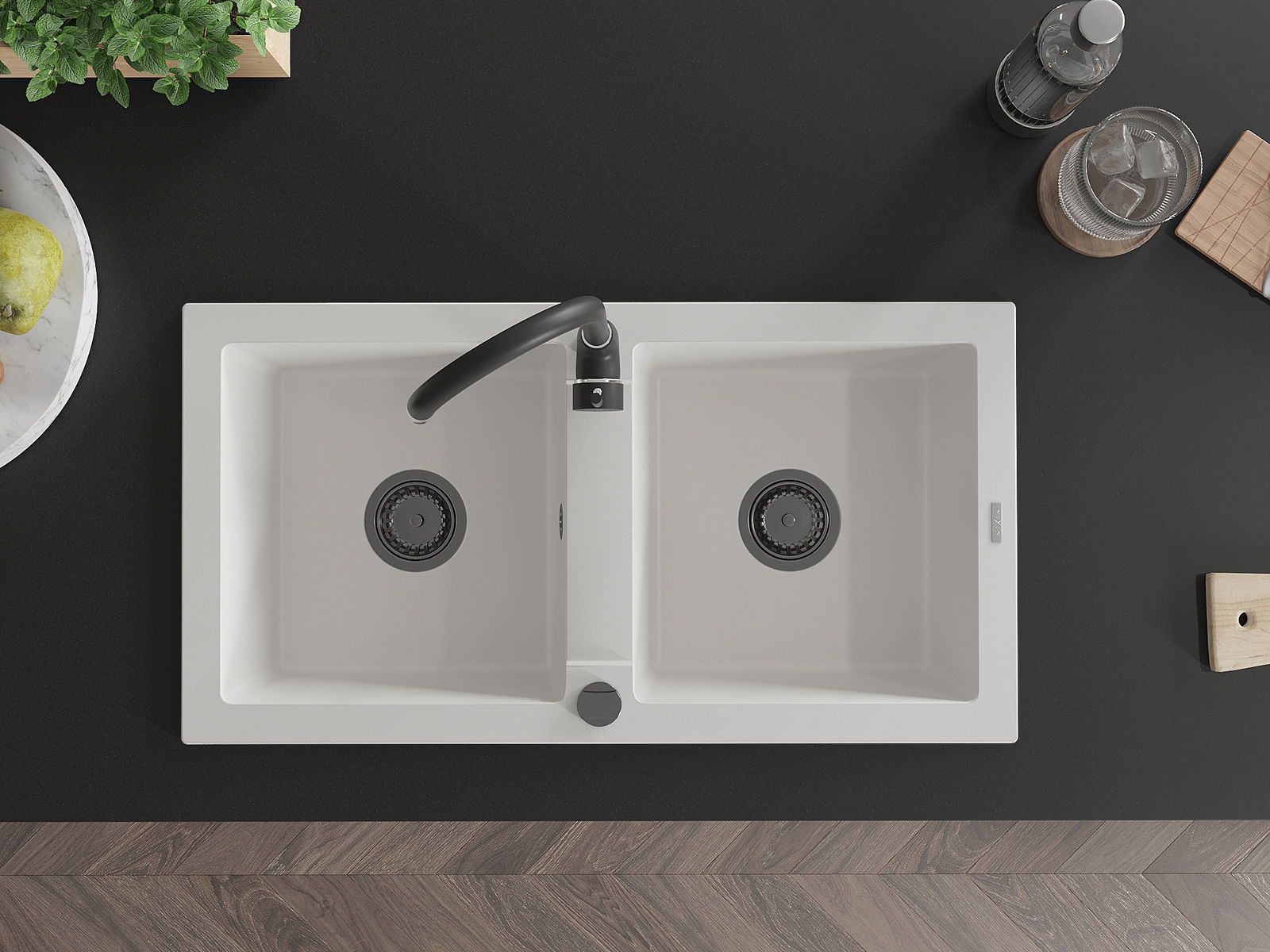Mexen Mario évier en granit 2 compartiments 820 x 436 mm, blanc, siphon noir - 6504822000-20-B