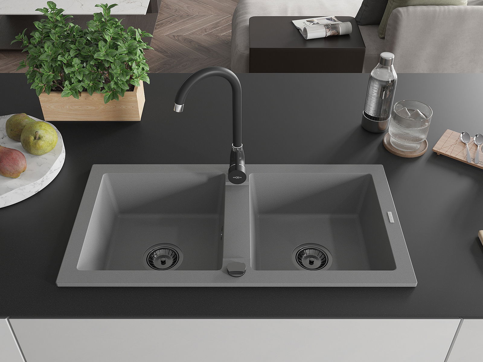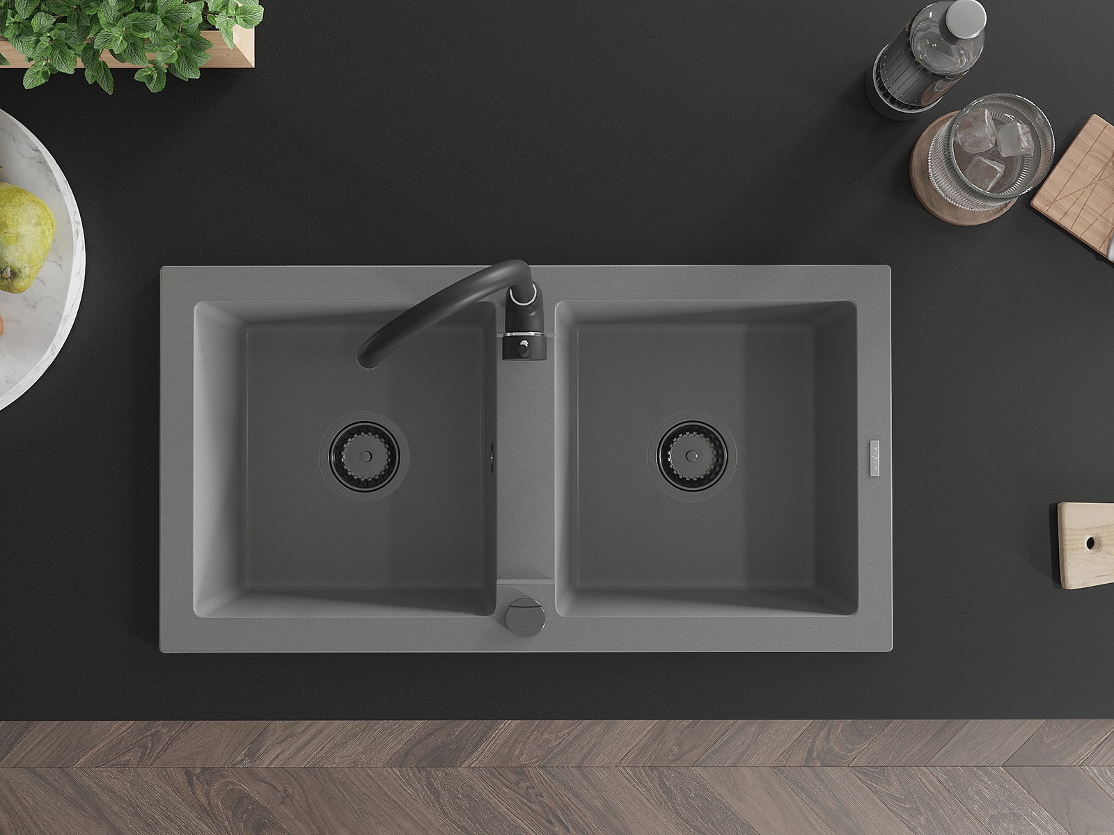 Mexen Mario évier en granit 2 bacs 820 x 436 mm, gris, siphon noir - 6504822000-71-B
