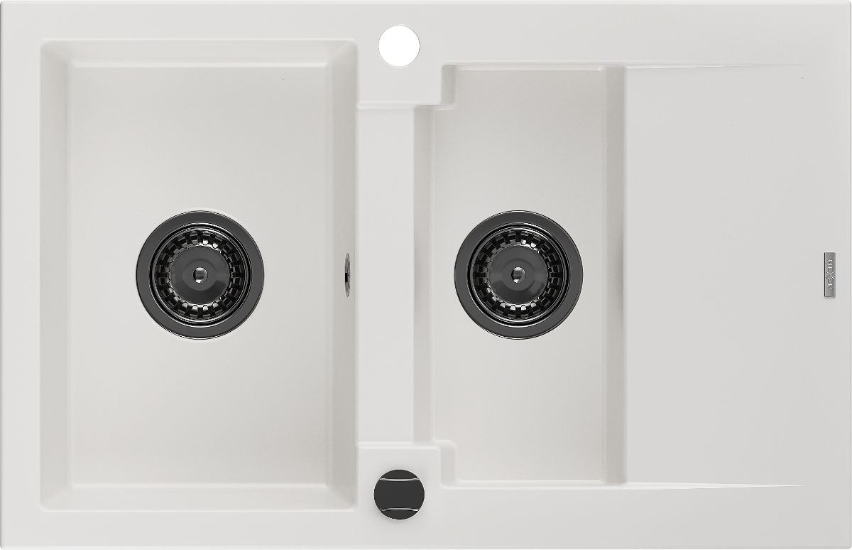 Mexen Gaspar évier en granit 1,5 bac avec égouttoir 737 x 475 mm, blanc, siphon noir - 6507731505-20-B