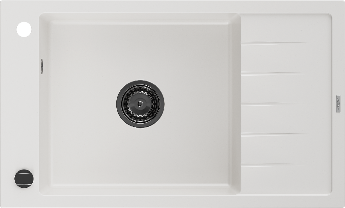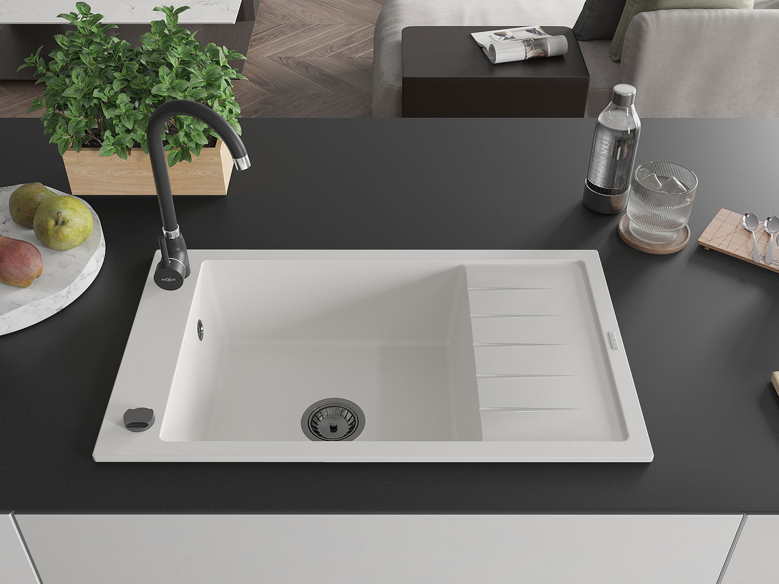 Mexen Elias évier en granit 1 cuve avec égouttoir 795 x 480 mm, blanc, siphon noir - 6511791005-20-B