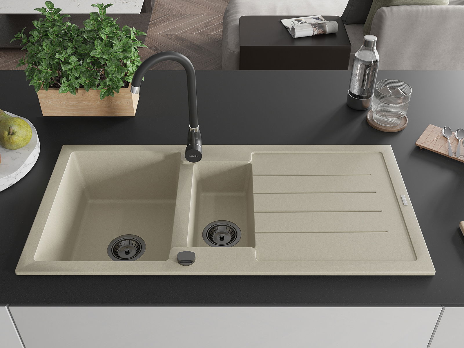 Mexen Andres évier en granit 1,5 bac avec égouttoir 1000 x 500 mm, beige, siphon noir - 6515101510-69-B