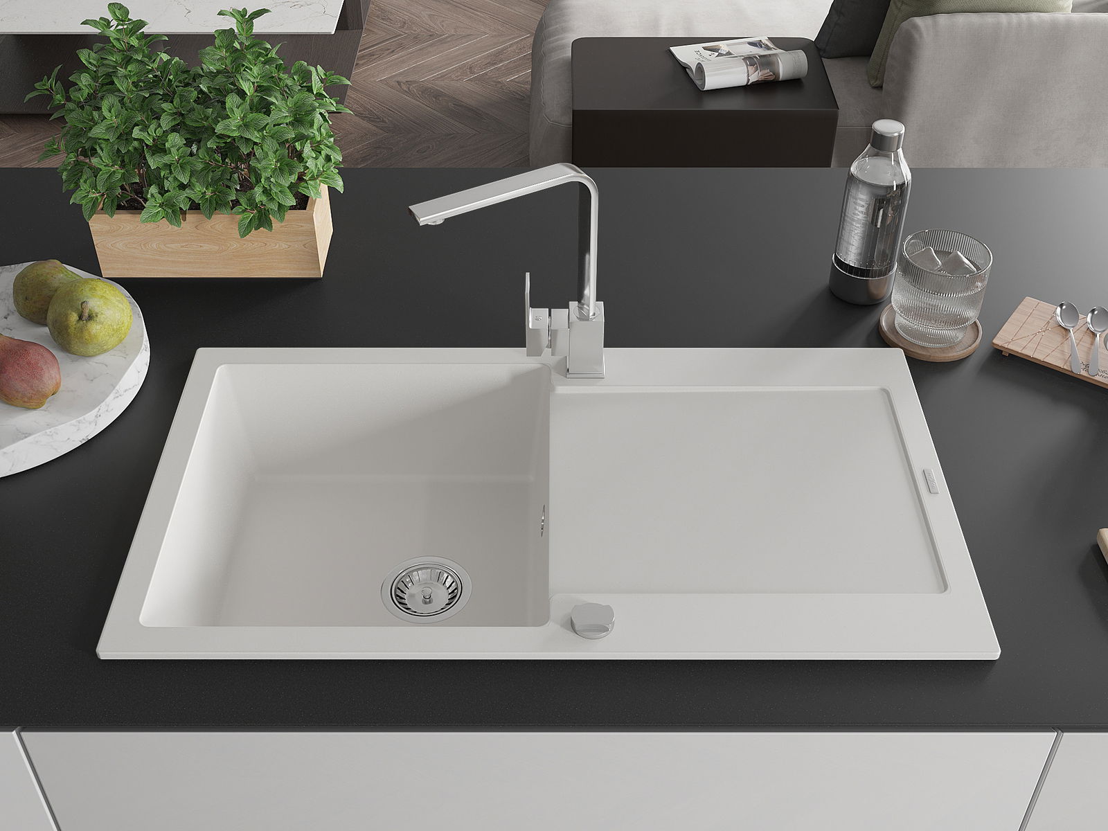 Mexen Leo évier en granit 1 bac avec égouttoir et robinet de cuisine Rita, blanc - 6501-20-670300-00
