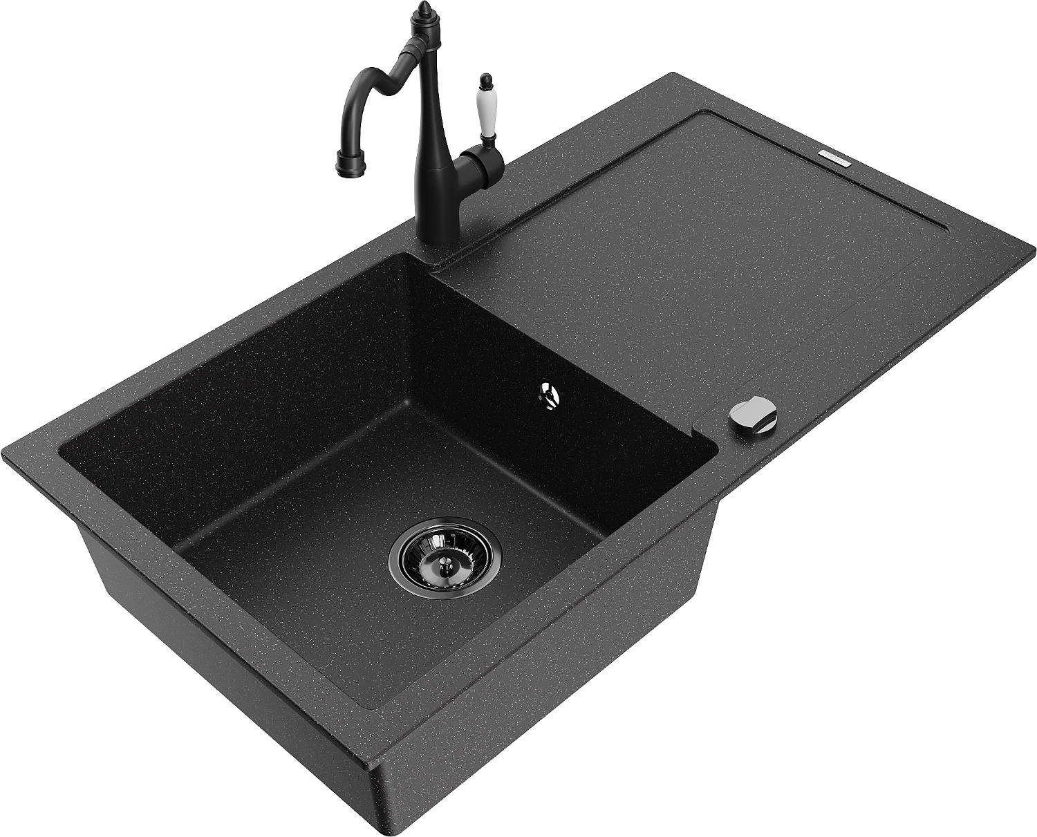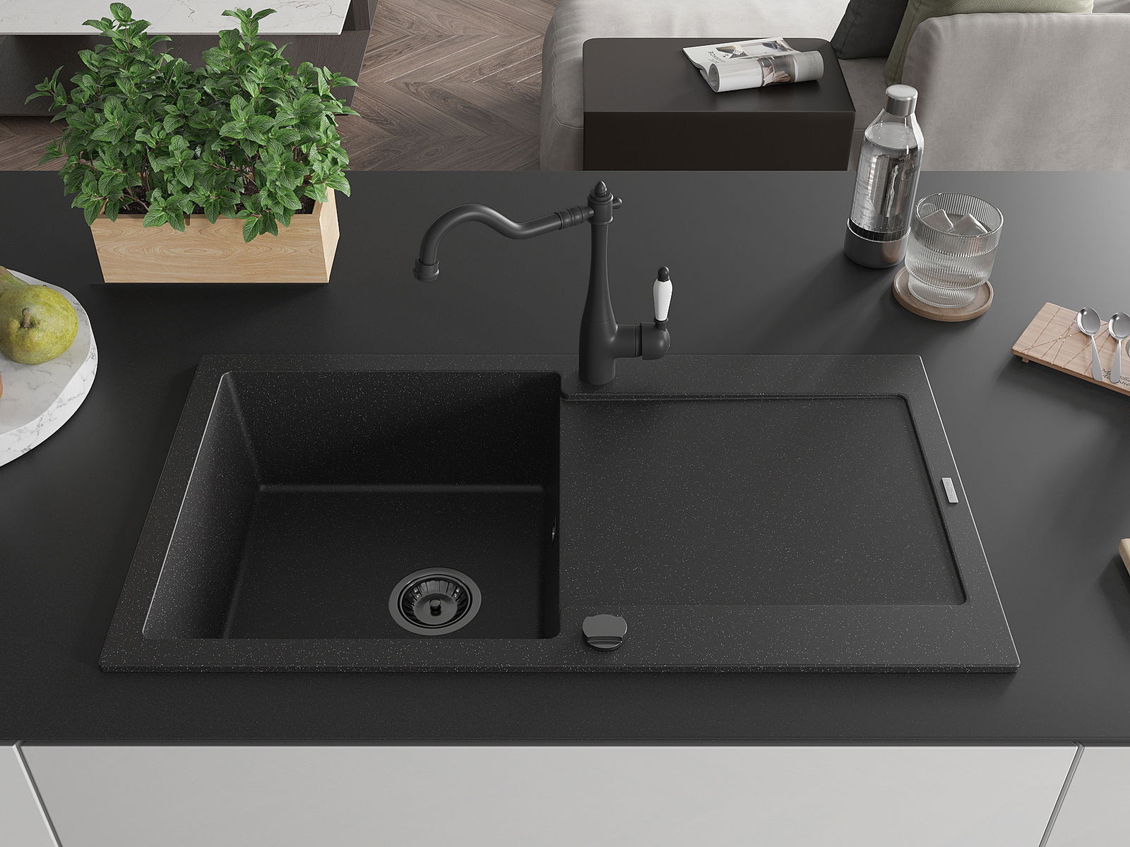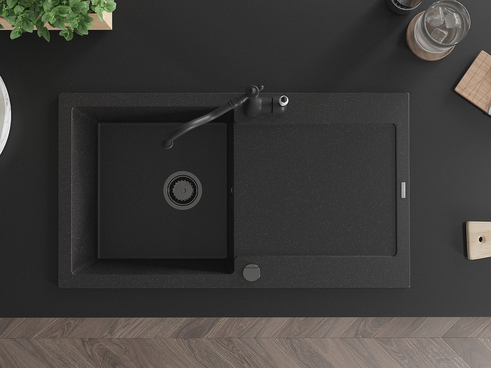 Mexen Leo évier en granit 1 bassin avec égouttoir et robinet de cuisine Carla, noir/métallique argenté - 6501-73-670700-70-B