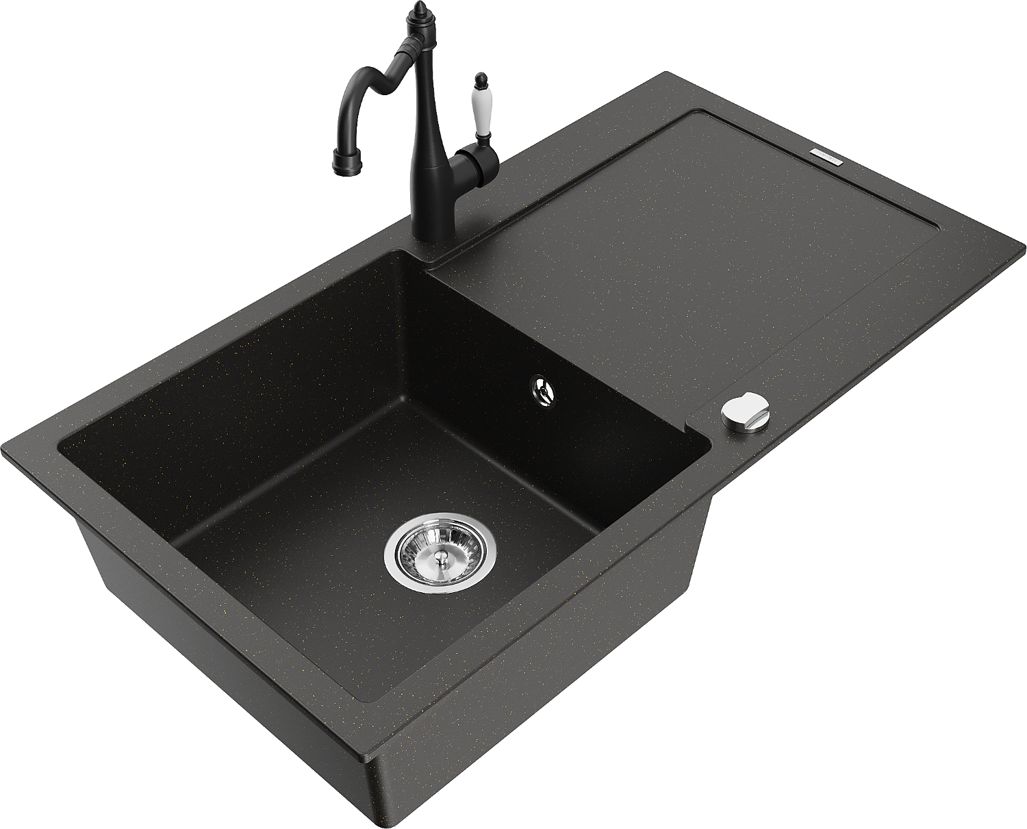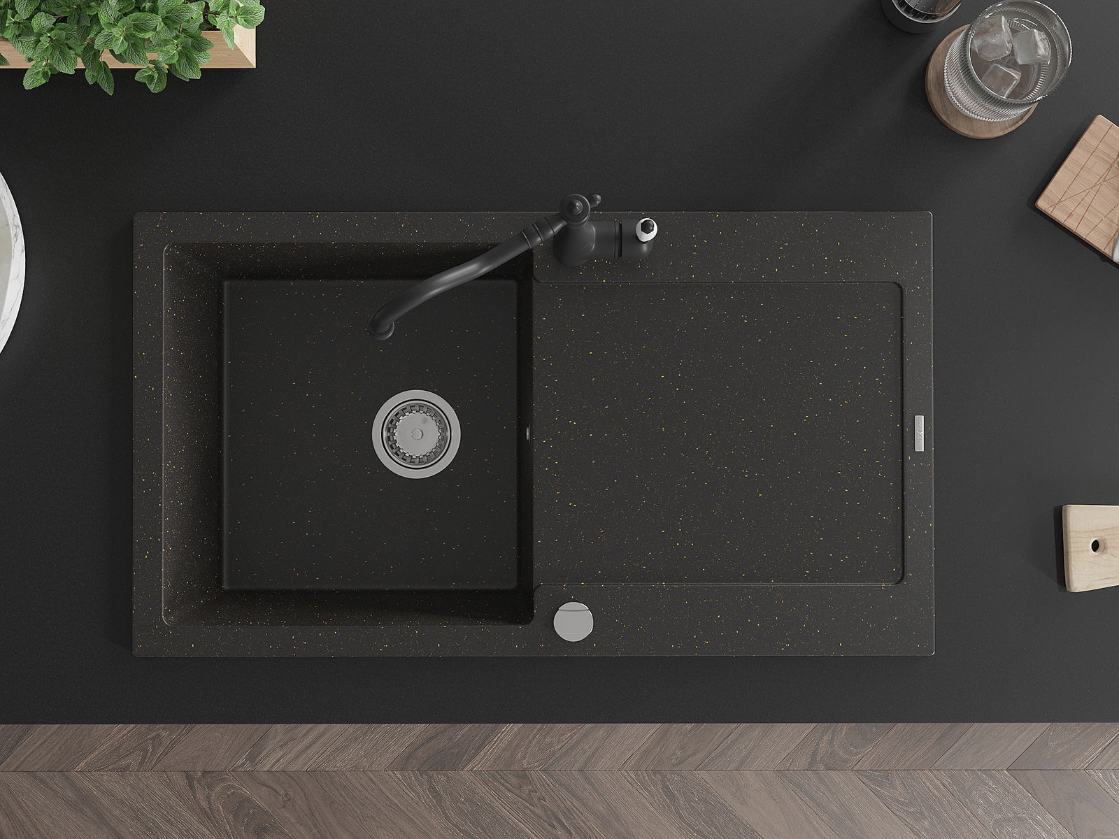 Mexen Leo évier granitique 1 bac avec égouttoir et mitigeur de cuisine Carla, noir/doré métallisé - 6501-75-670700-70