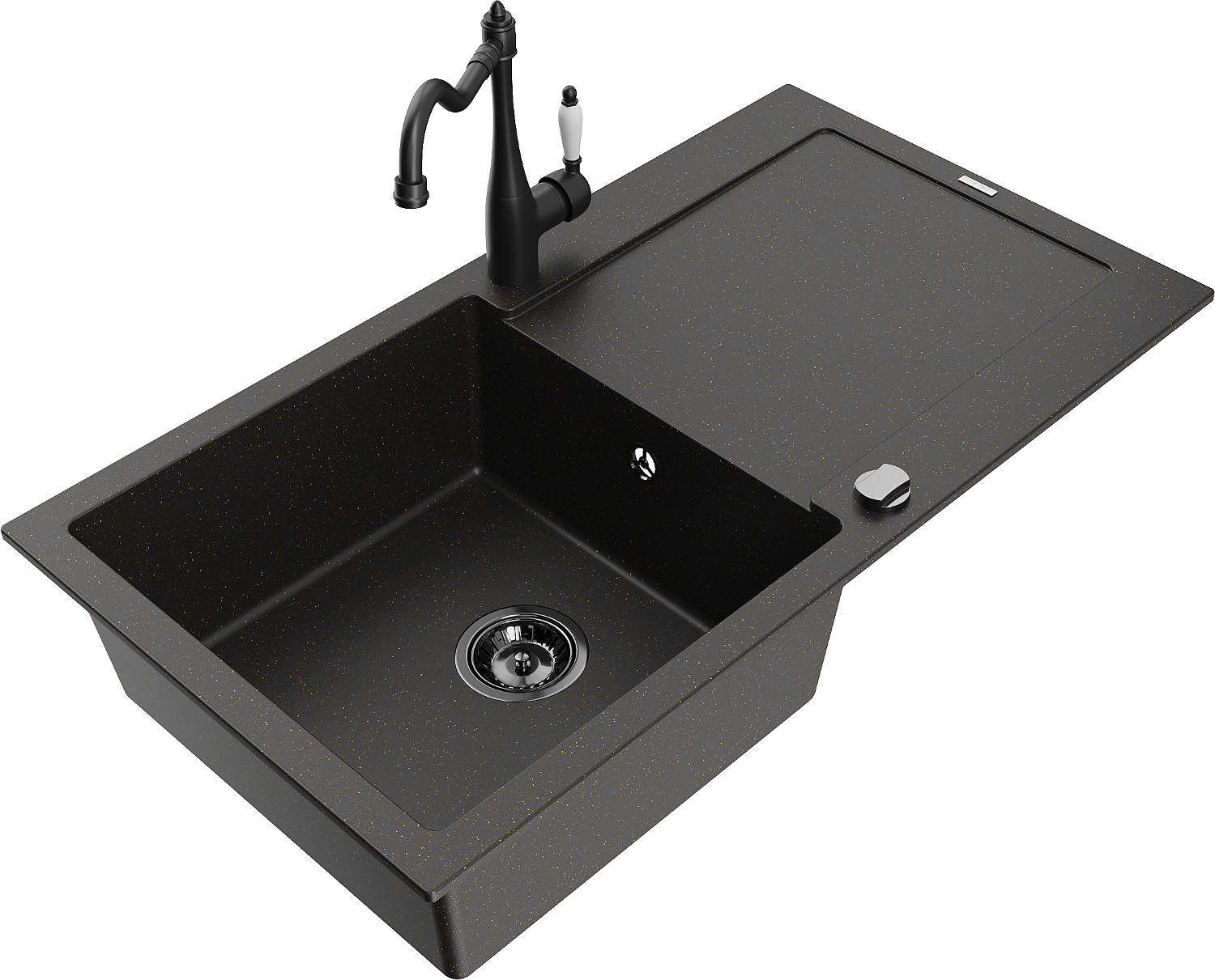 Mexen Leo évier en granit à 1 bac avec égouttoir et robinet de cuisine Carla, noir/or métallisé - 6501-75-670700-70-B