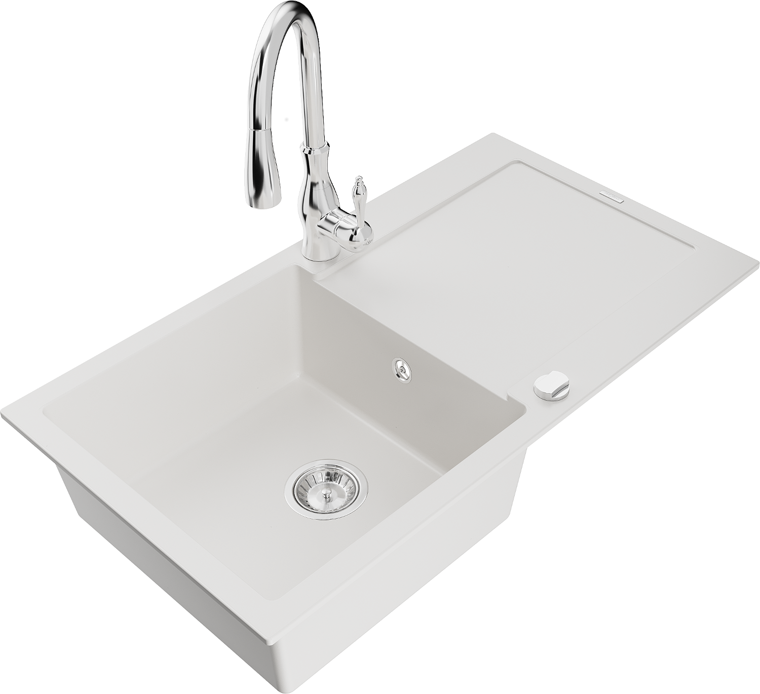 Mexen Leo évier en granit 1 bac avec égouttoir et robinet de cuisine Savita, blanc - 6501-20-672601-00