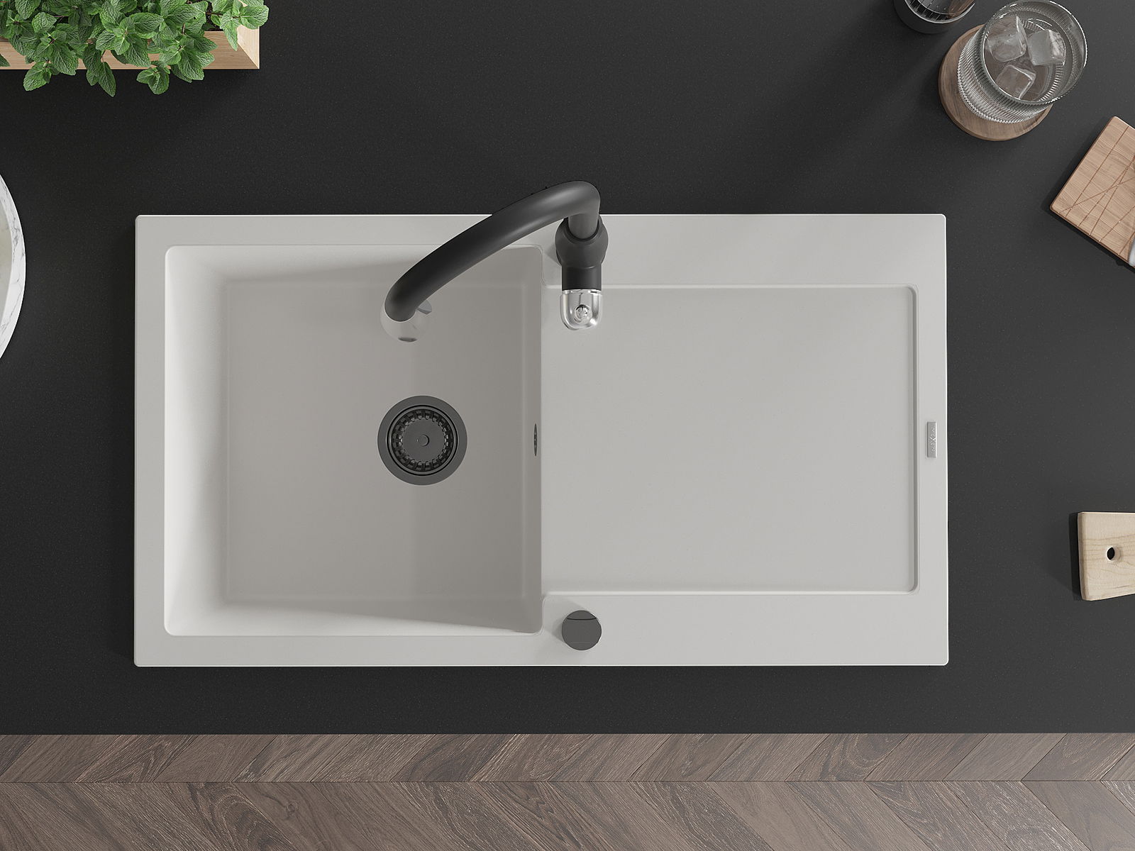 Mexen Leo évier en granit à 1 bac avec égouttoir et robinet de cuisine Savita, blanc - 6501-20-672601-70