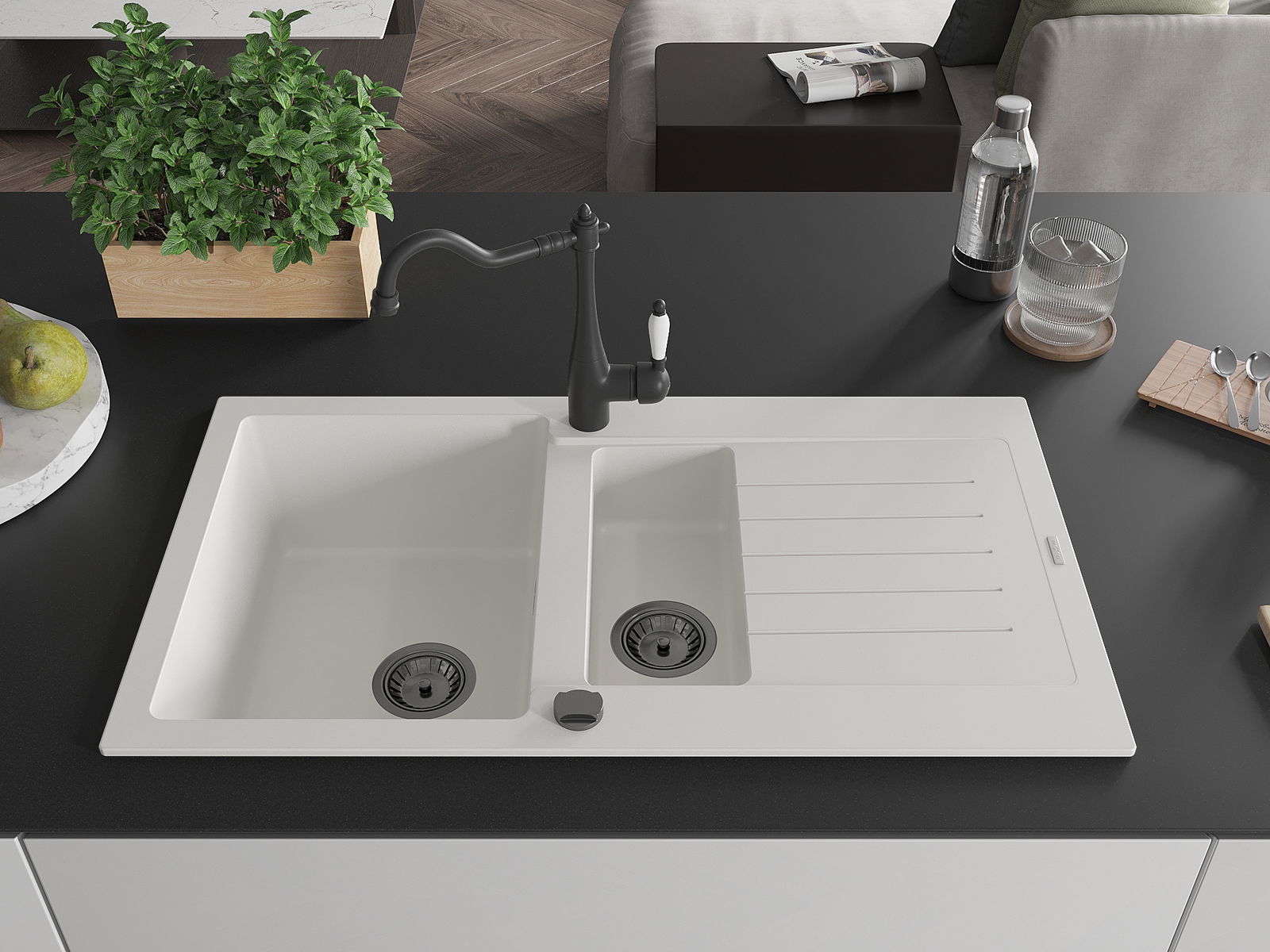 Mexen Matias évier en granite 1,5 bac avec égouttoir et robinet de cuisine Carla, blanc - 6502-20-670700-70