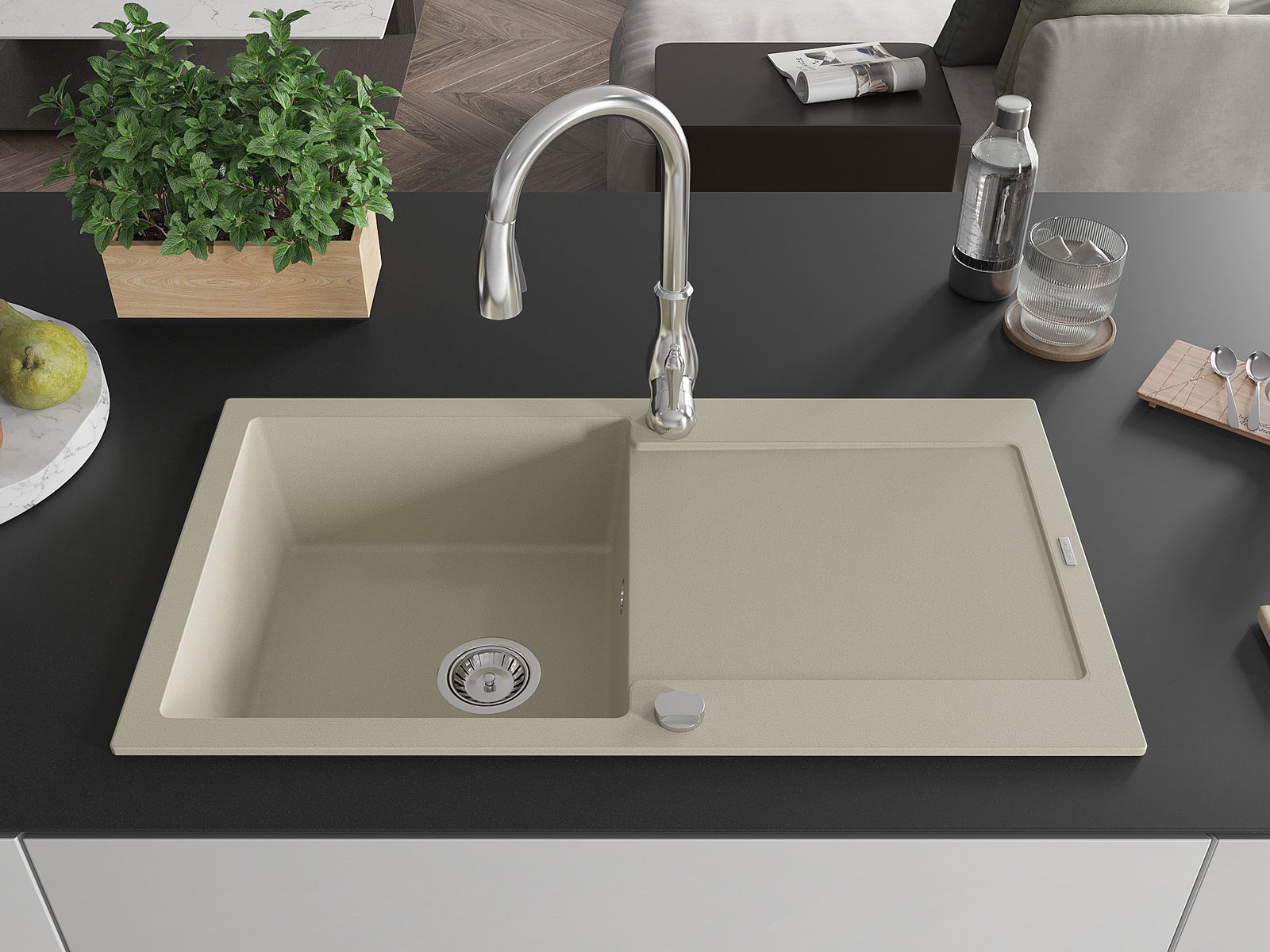 Mexen Leo évier en granit 1 bac avec égouttoir et robinet de cuisine Savita, beige - 6501-69-672601-00