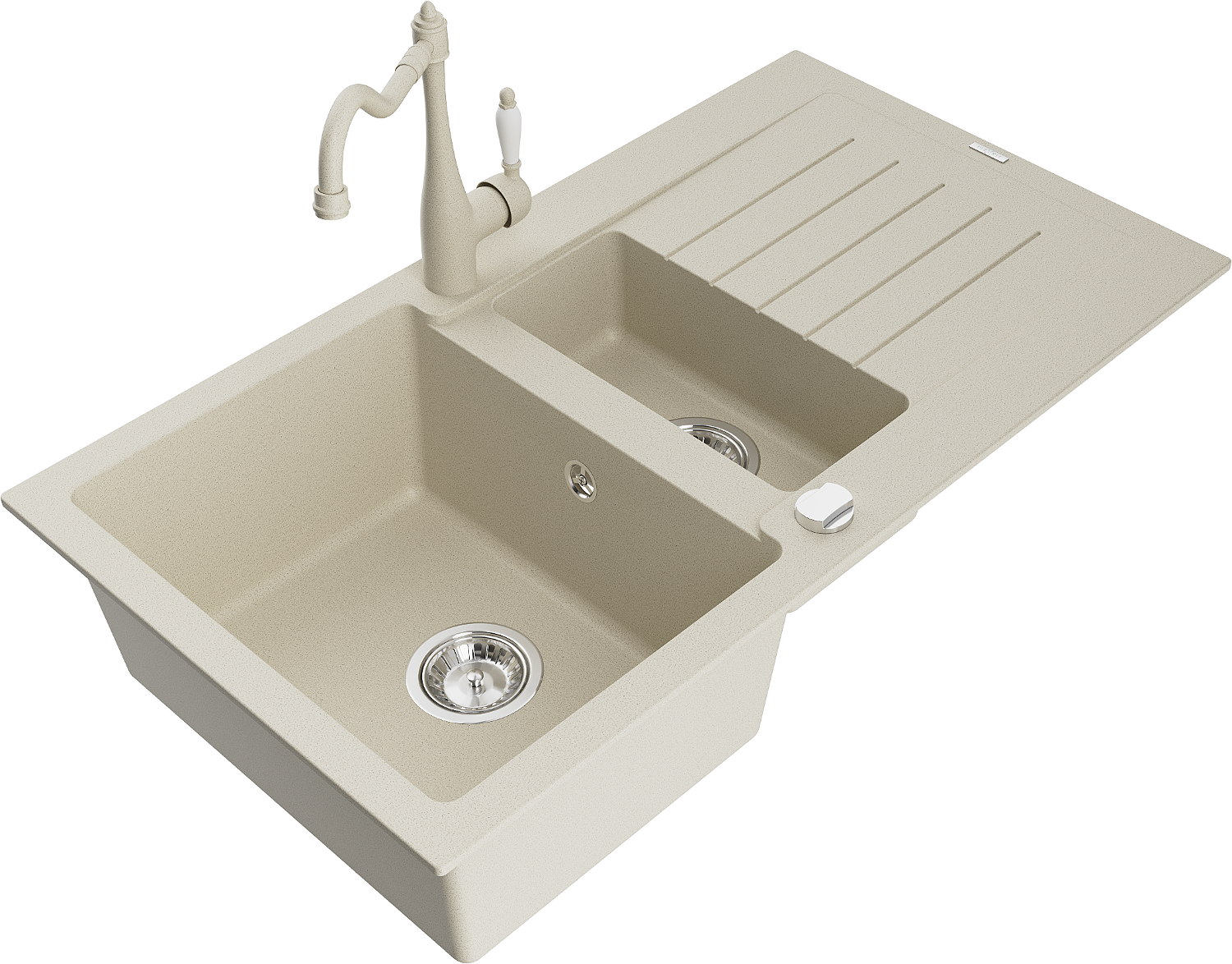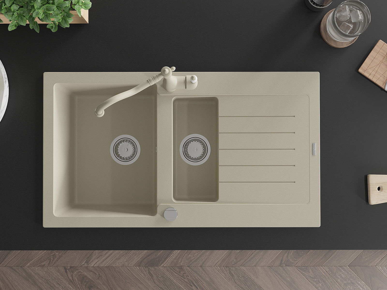 Mexen Matias évier en granit 1,5 bac avec égouttoir et robinet de cuisine Carla, beige - 6502-69-670700-69