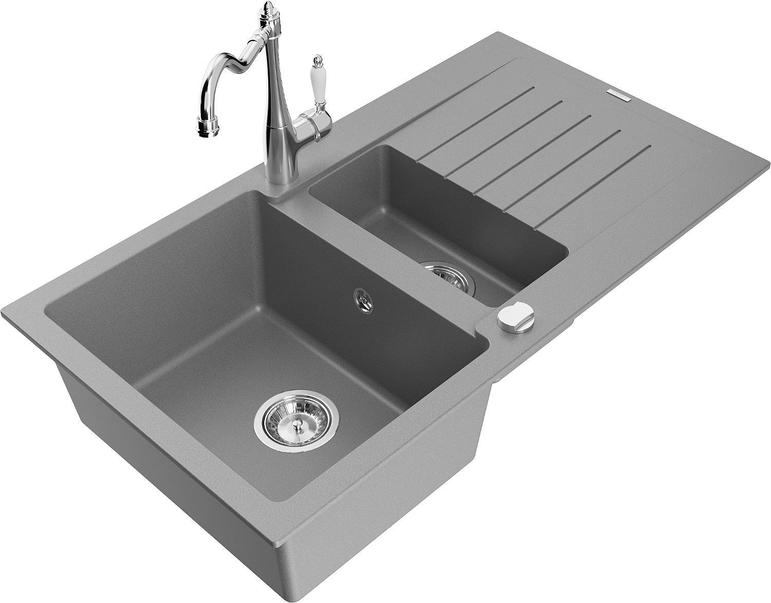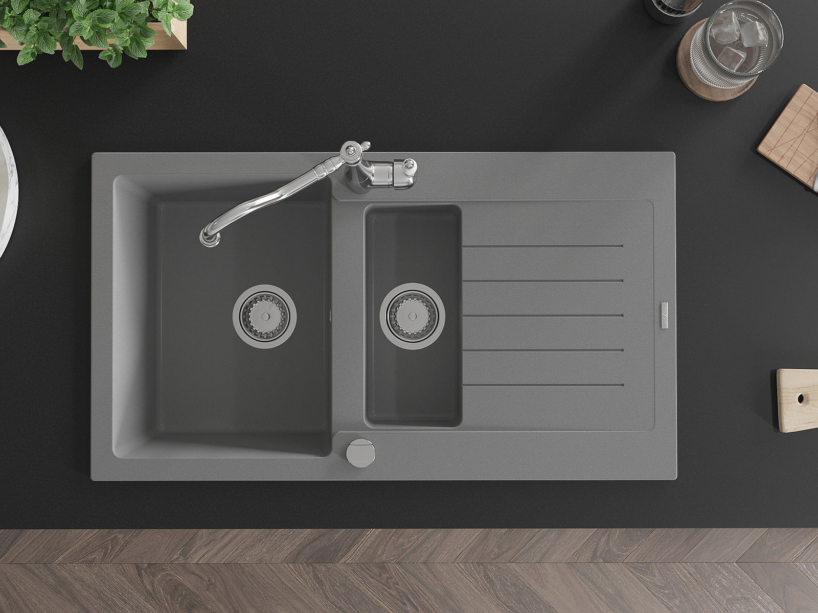 Mexen Matias évier en granit 1,5 bac avec égouttoir et robinet de cuisine Carla, gris - 6502-71-670700-00