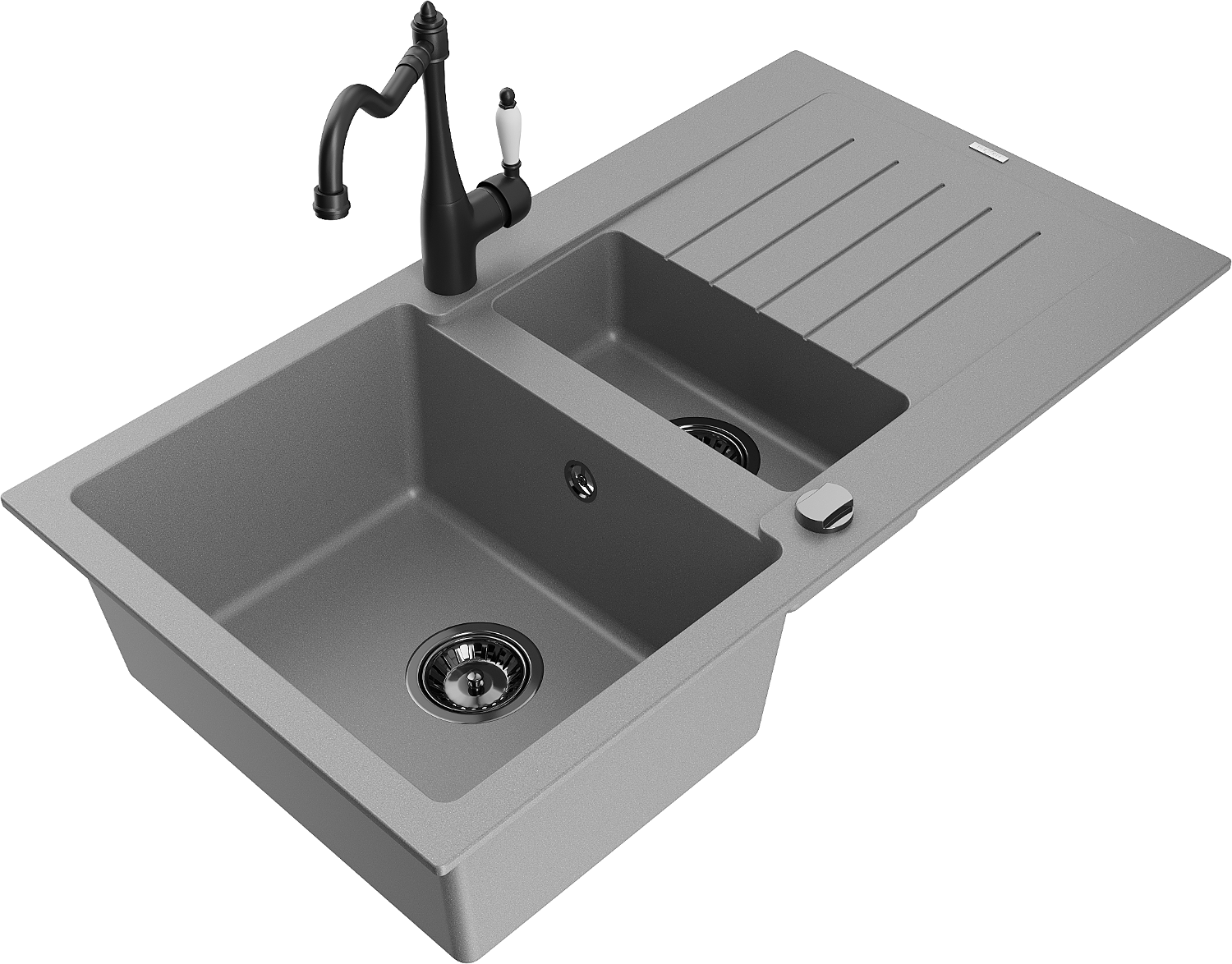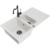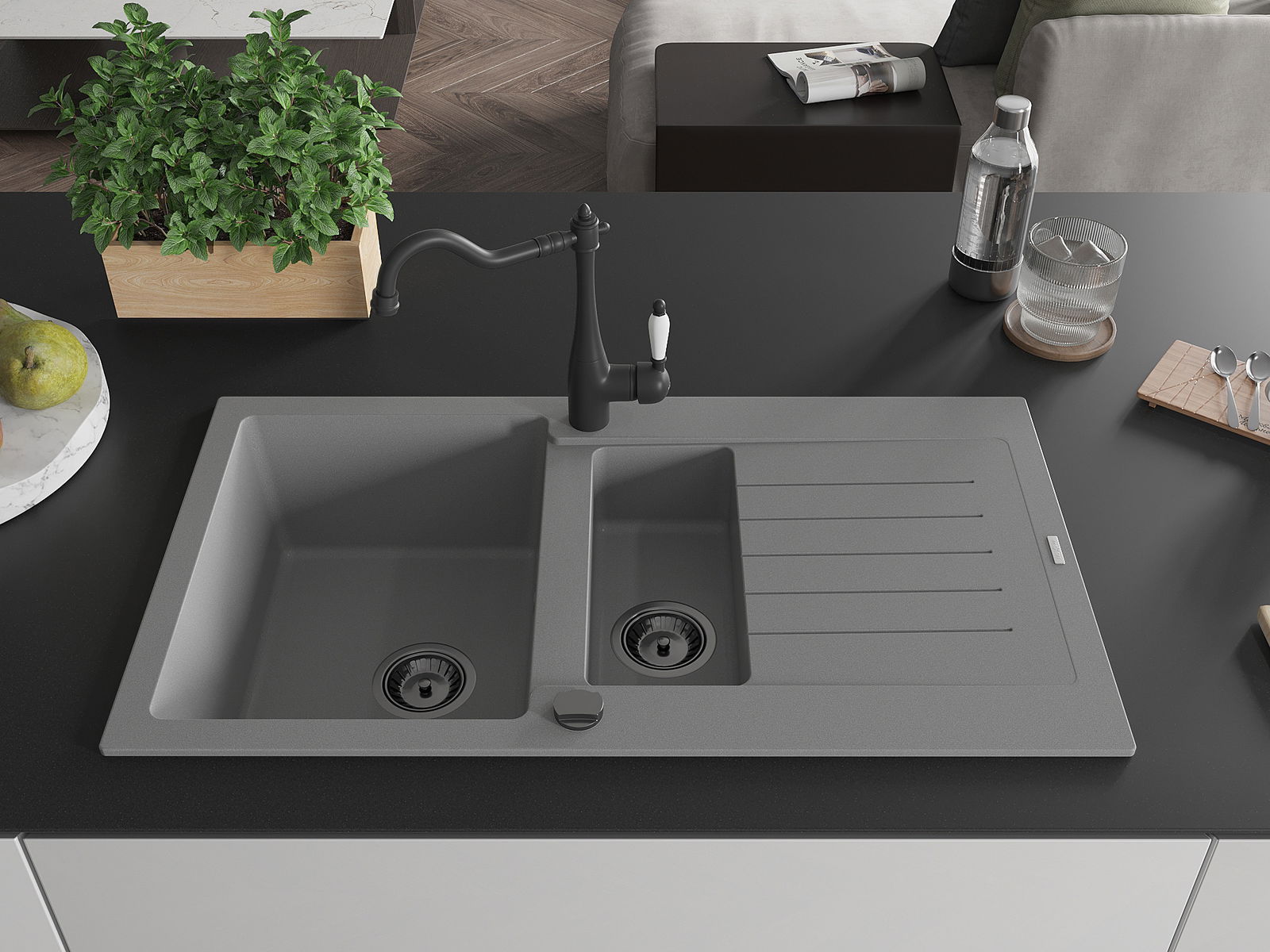 Mexen Matias évier en granit 1,5 bac avec égouttoir et robinet de cuisine Carla, gris - 6502-71-670700-70-B