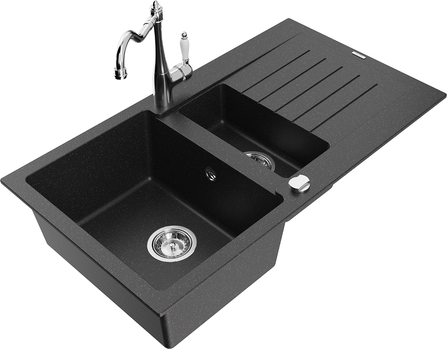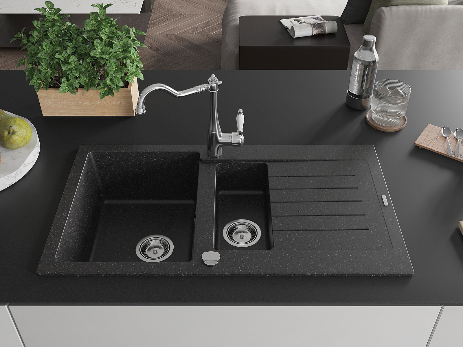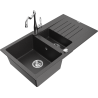 Mexen Matias évier en granit 1,5 bac avec égouttoir et robinet de cuisine Carla noir/argent métallisé - 6502-73-670700-00