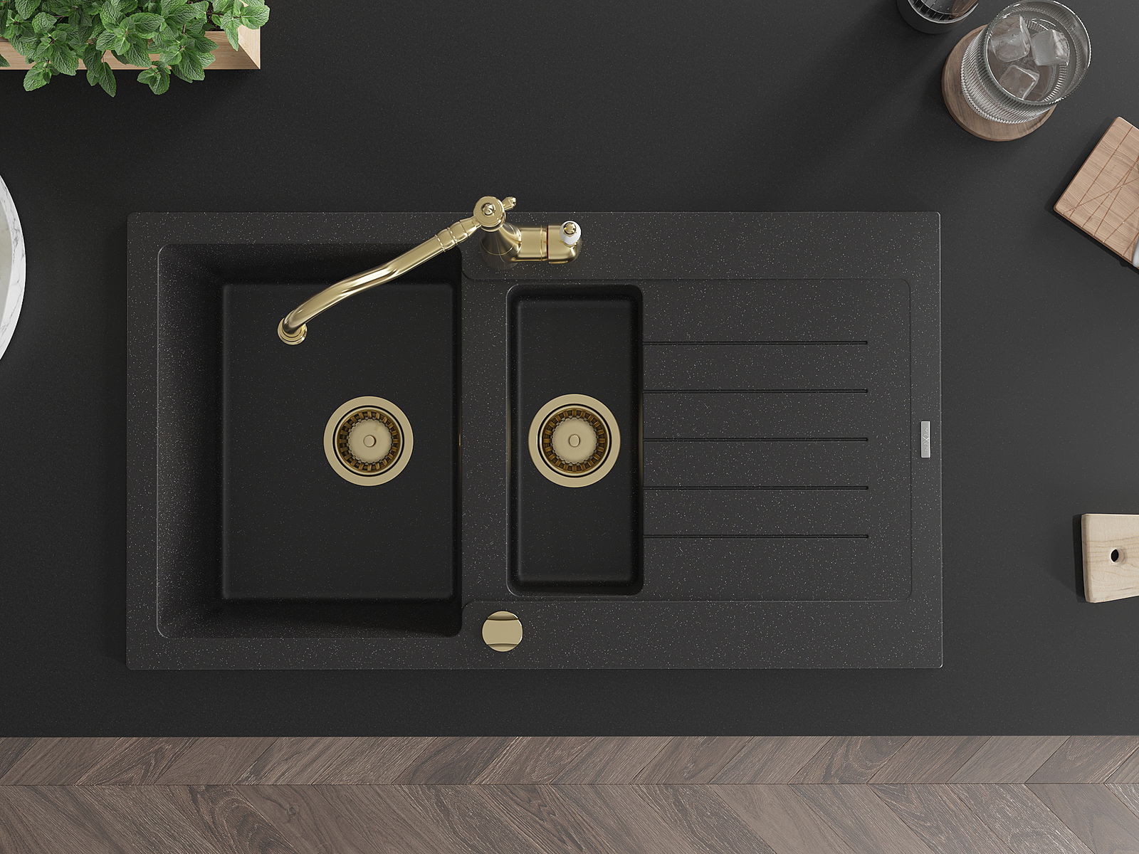 Mexen Matias évier en granit 1,5 bac avec égouttoir et robinet de cuisine Carla noir/argent métallique - 6502-73-670700-50