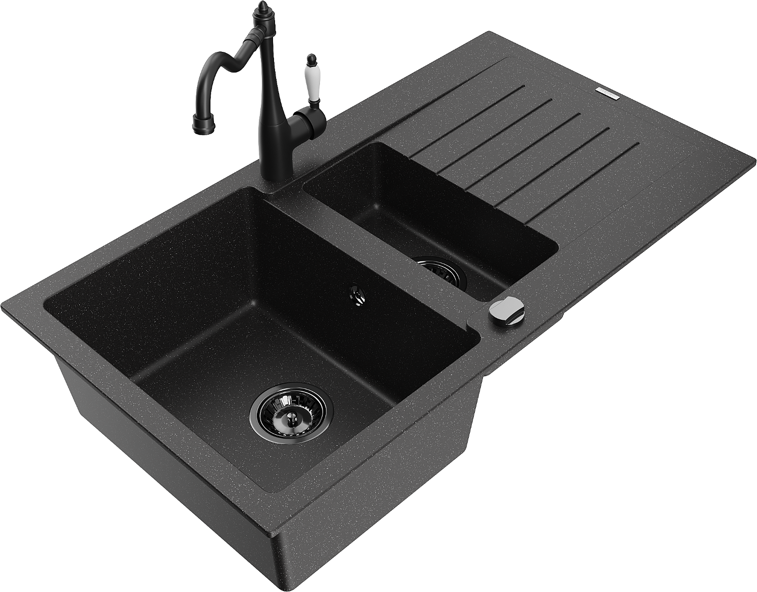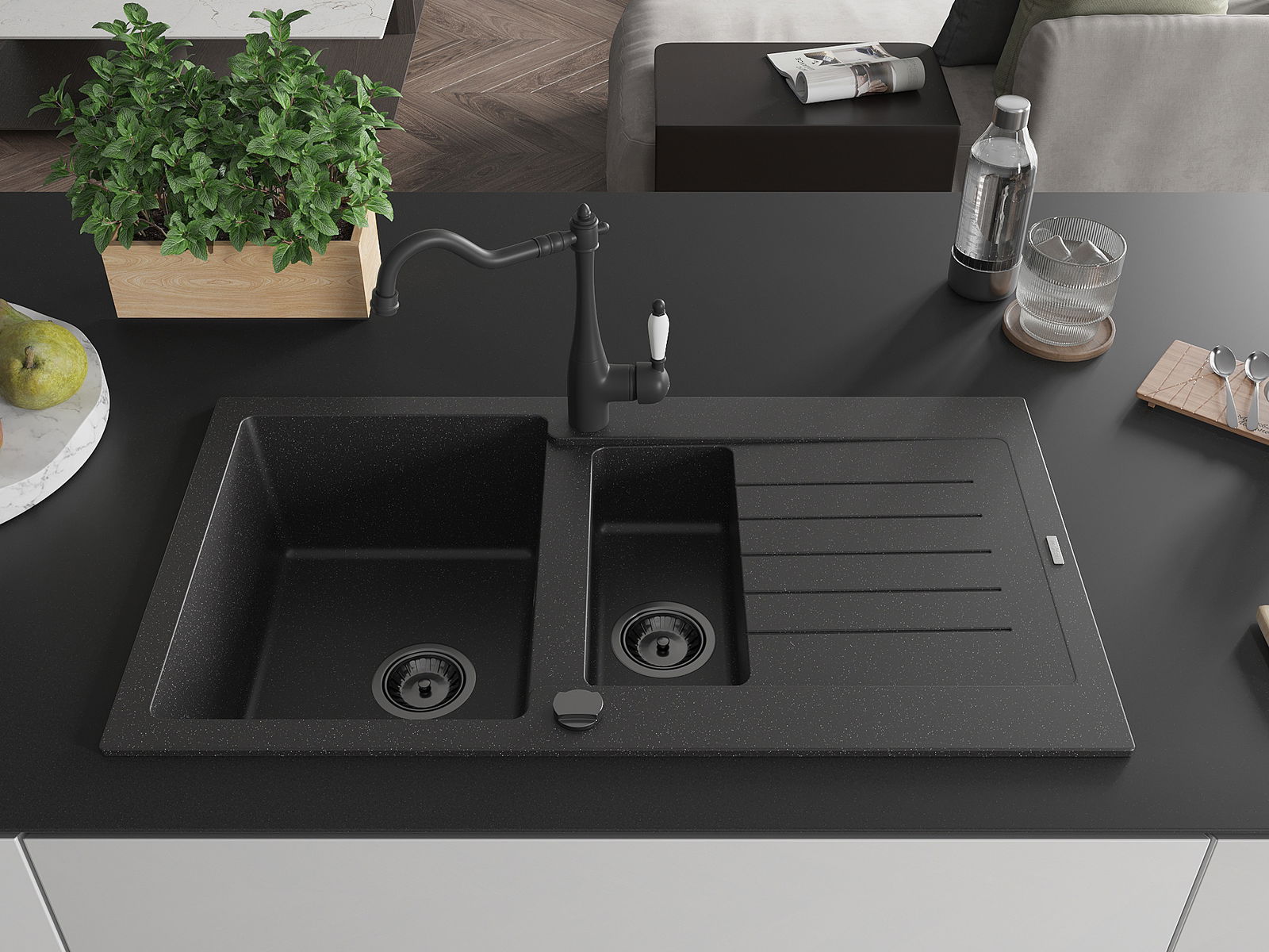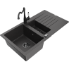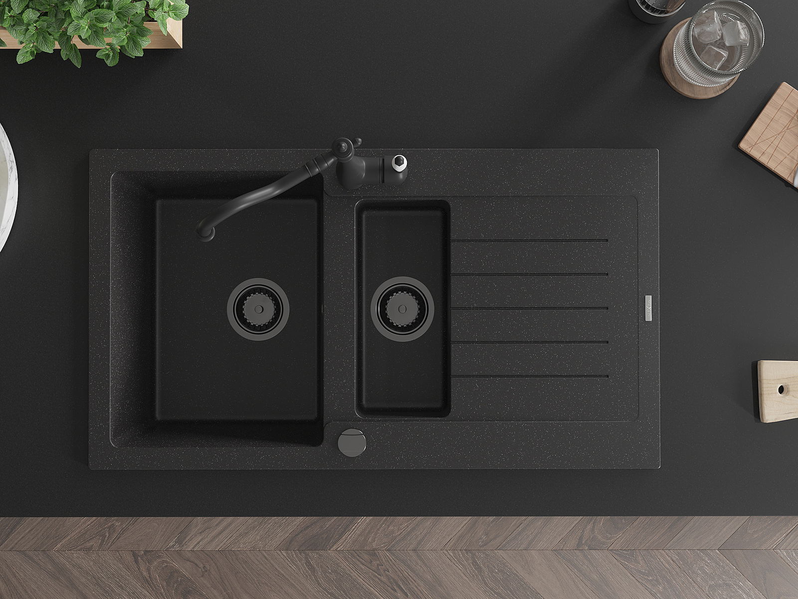 Mexen Matias évier en granit 1,5 cuve avec égouttoir et robinet de cuisine Carla, noir/argent - 6502-73-670700-70-B