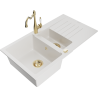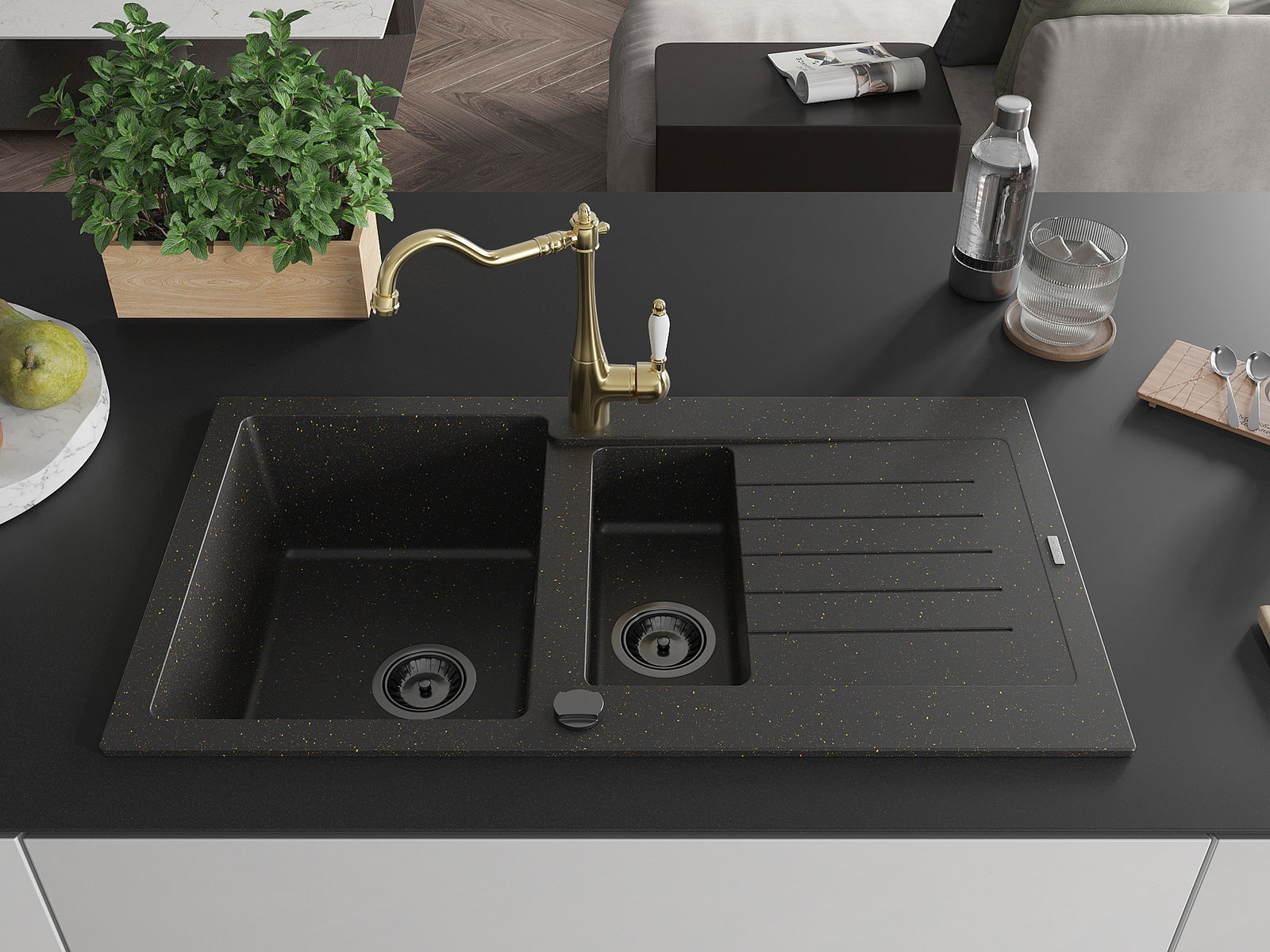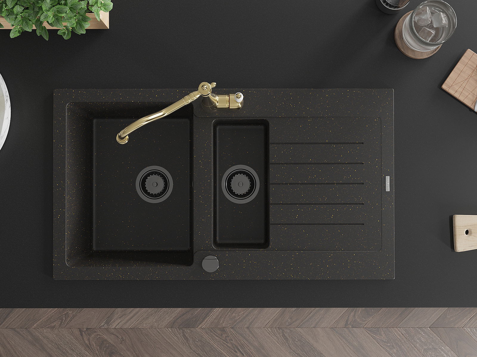 Mexen Matias évier en granit 1,5 cuves avec égouttoir et robinet de cuisine Carla noir/doré métallisé - 6502-75-670700-50-B