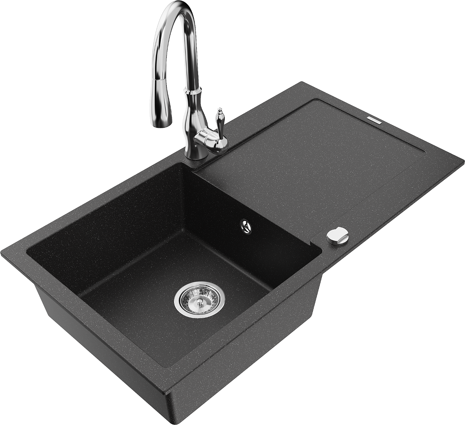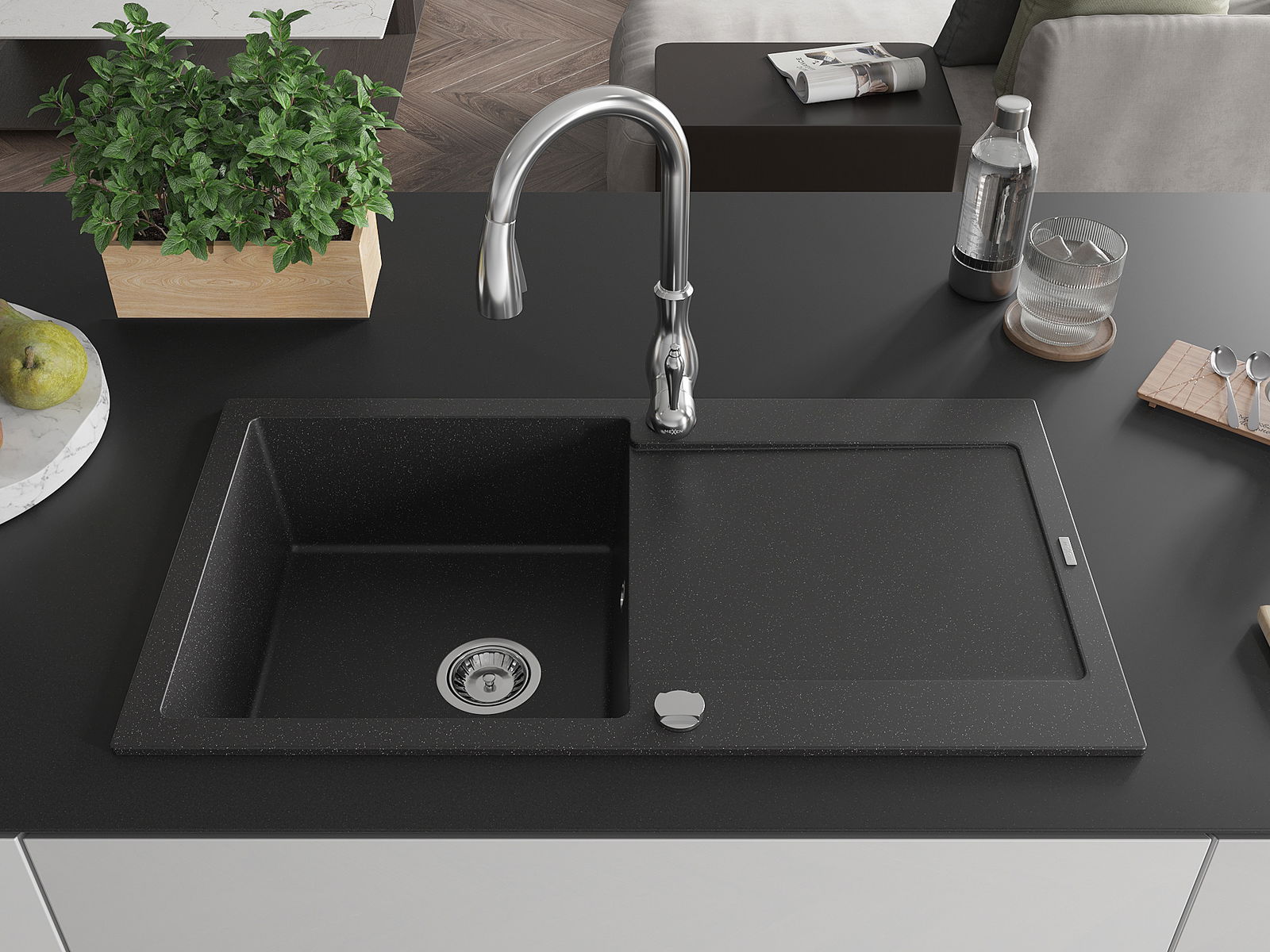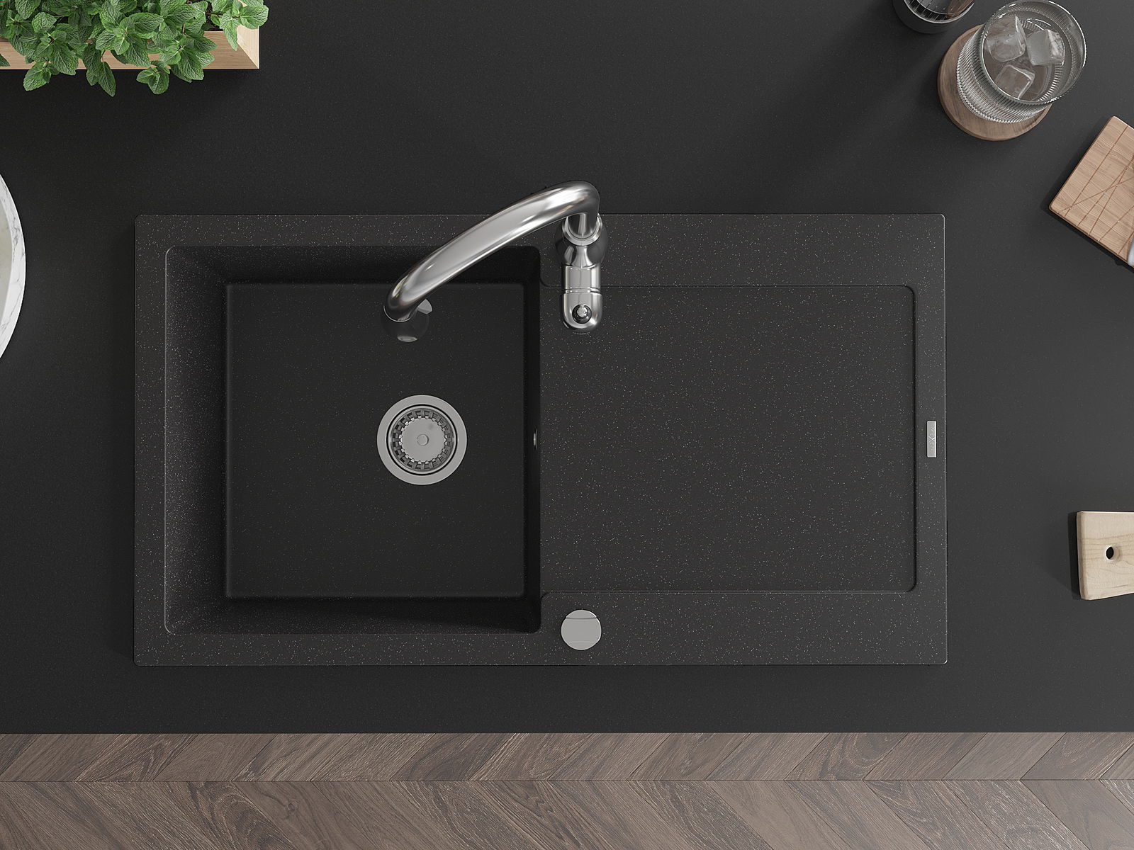 Mexen Leo évier composite 1 bac avec égouttoir et mitigeur de cuisine Savita, noir/métal argenté - 6501-73-672601-00