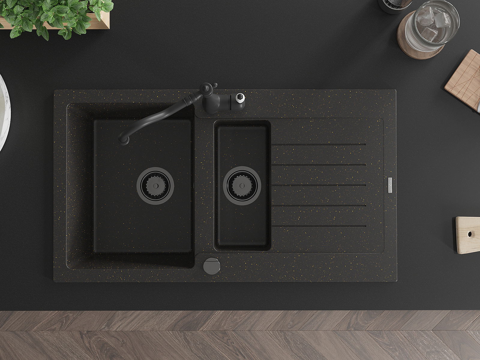 Mexen Matias évier en granit 1,5 bac avec égouttoir et robinet de cuisine Carla noir/or métallique - 6502-75-670700-70-B