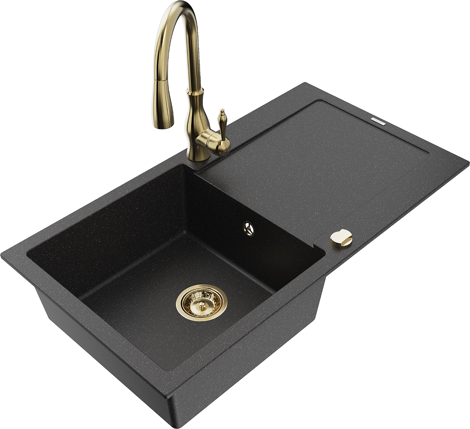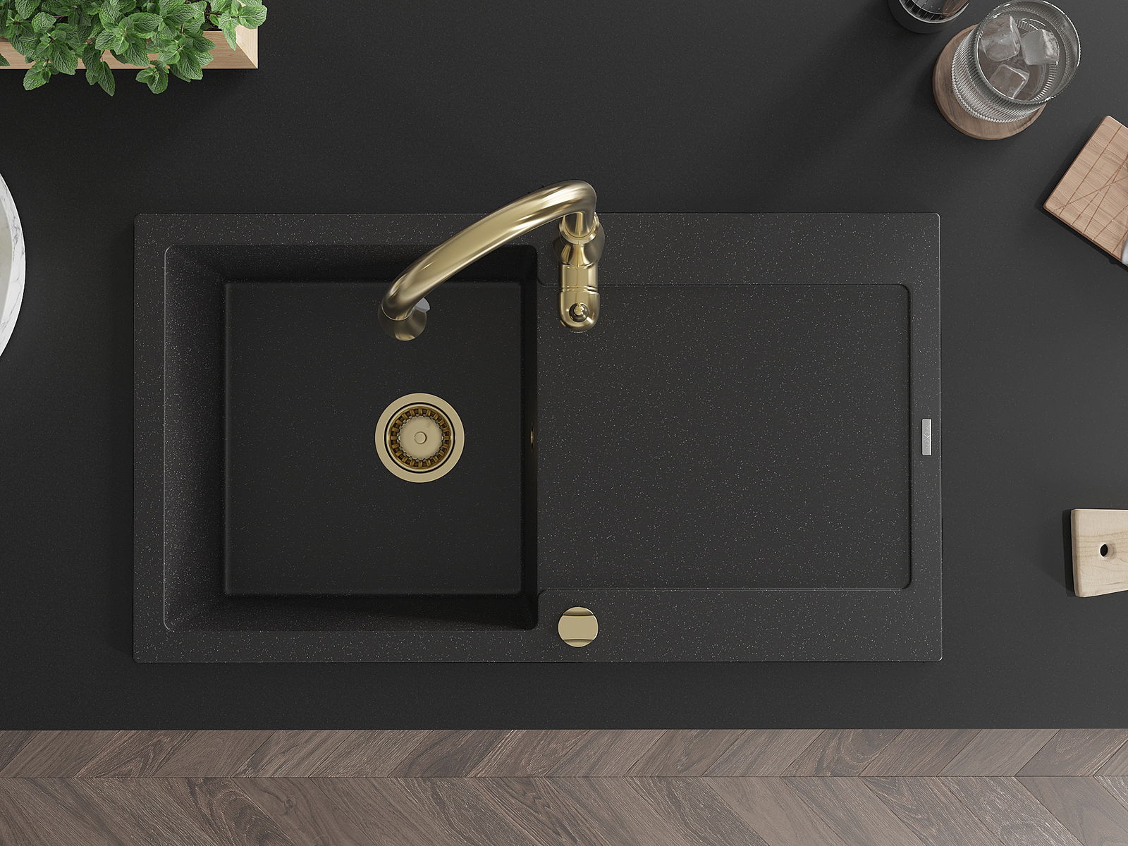 Mexen Leo évier en granit 1 bac avec égouttoir et robinet de cuisine Savita, noir/métallique argenté - 6501-73-672601-50