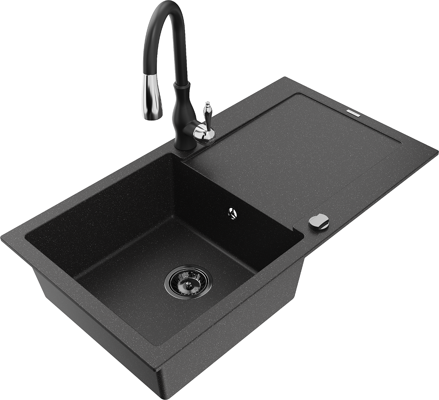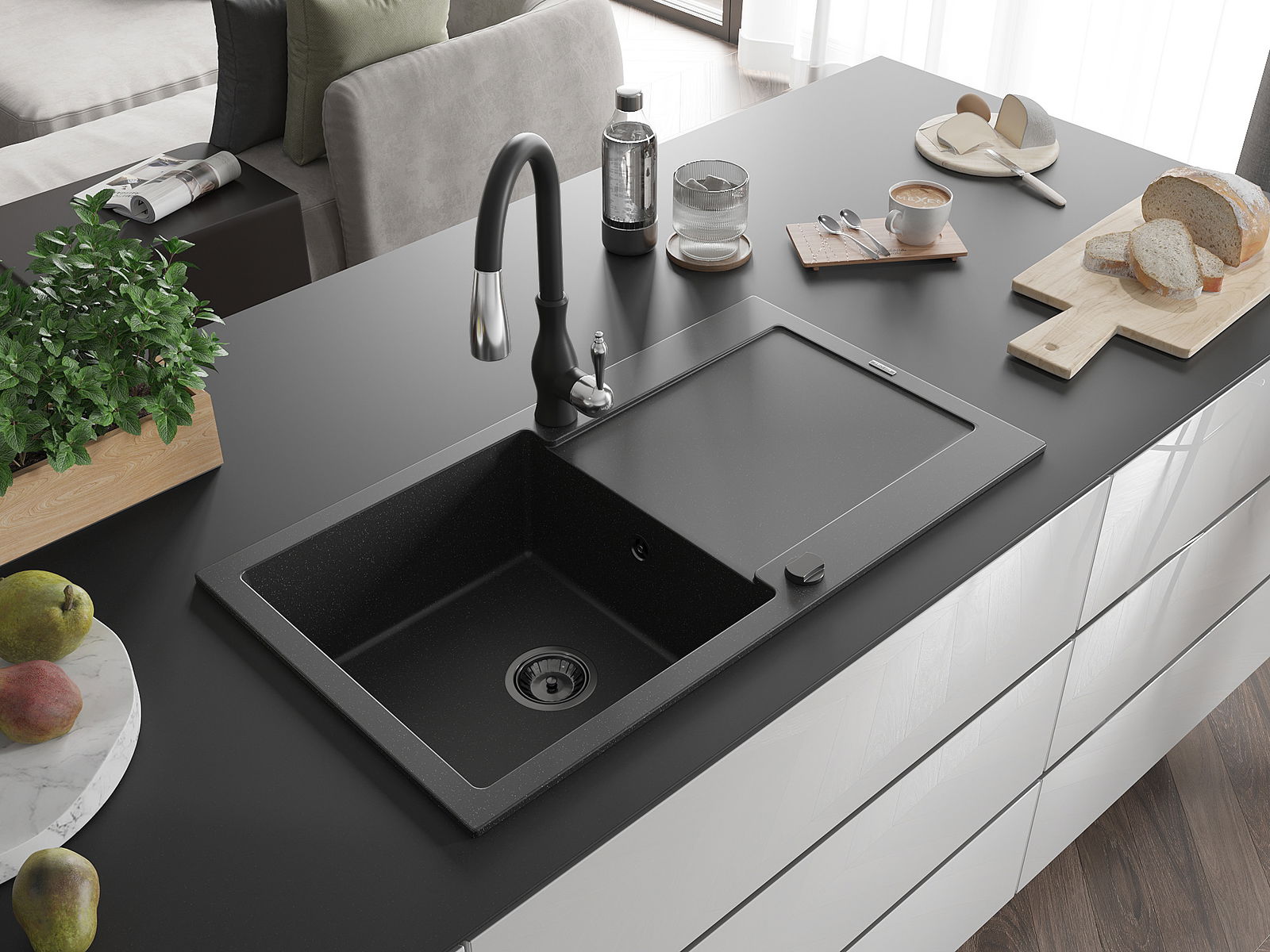 Mexen Leo évier en granit 1 bac avec égouttoir et robinet de cuisine Savita, noir/métal argenté - 6501-73-672601-70-B