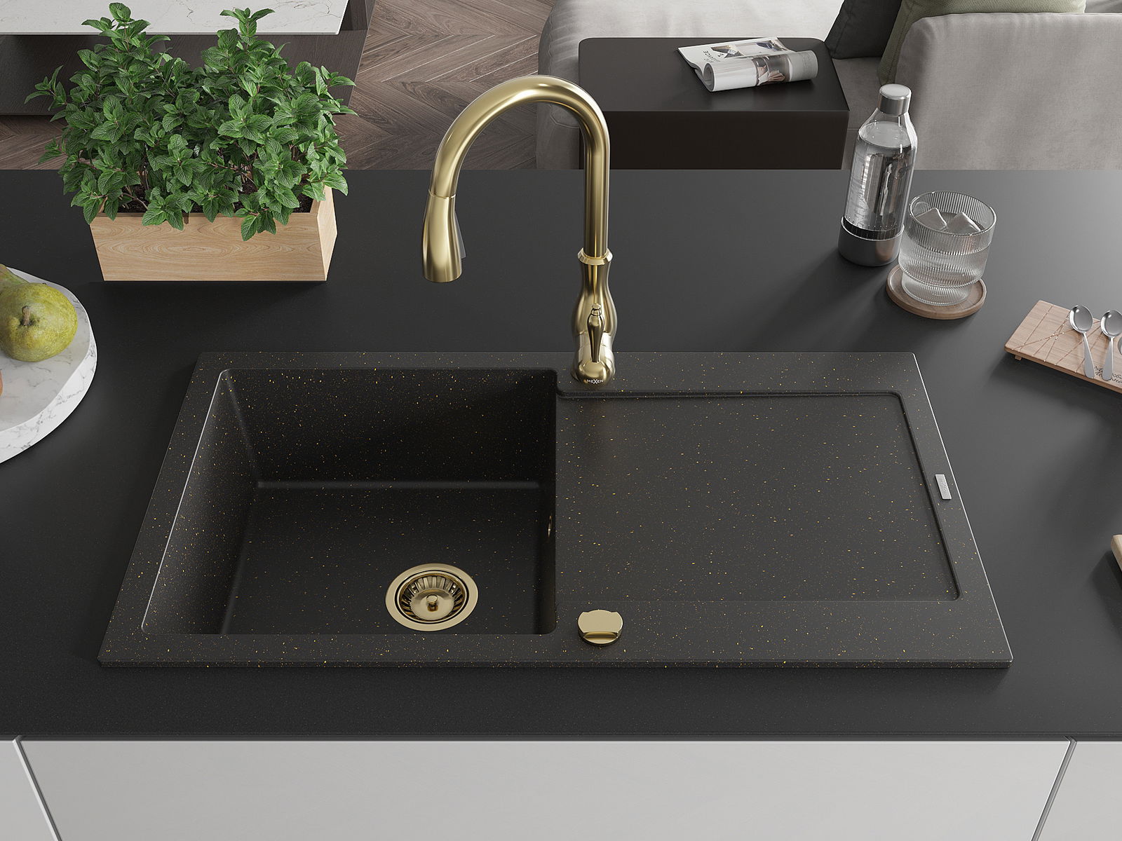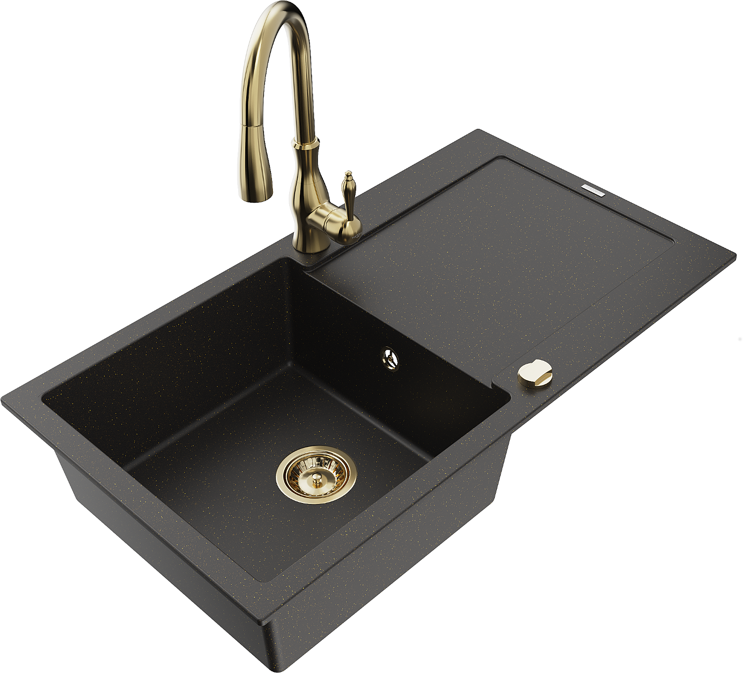 Mexen Leo évier granitique 1 bac avec égouttoir et robinet de cuisine Savita, noir/or métallique - 6501-75-672601-50