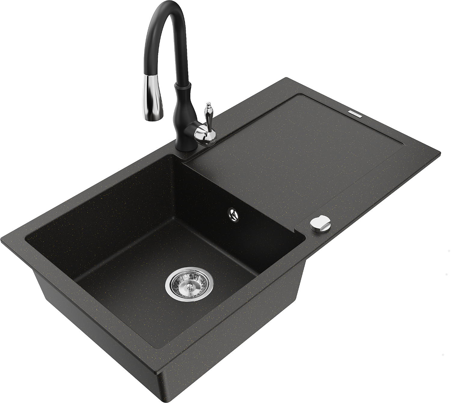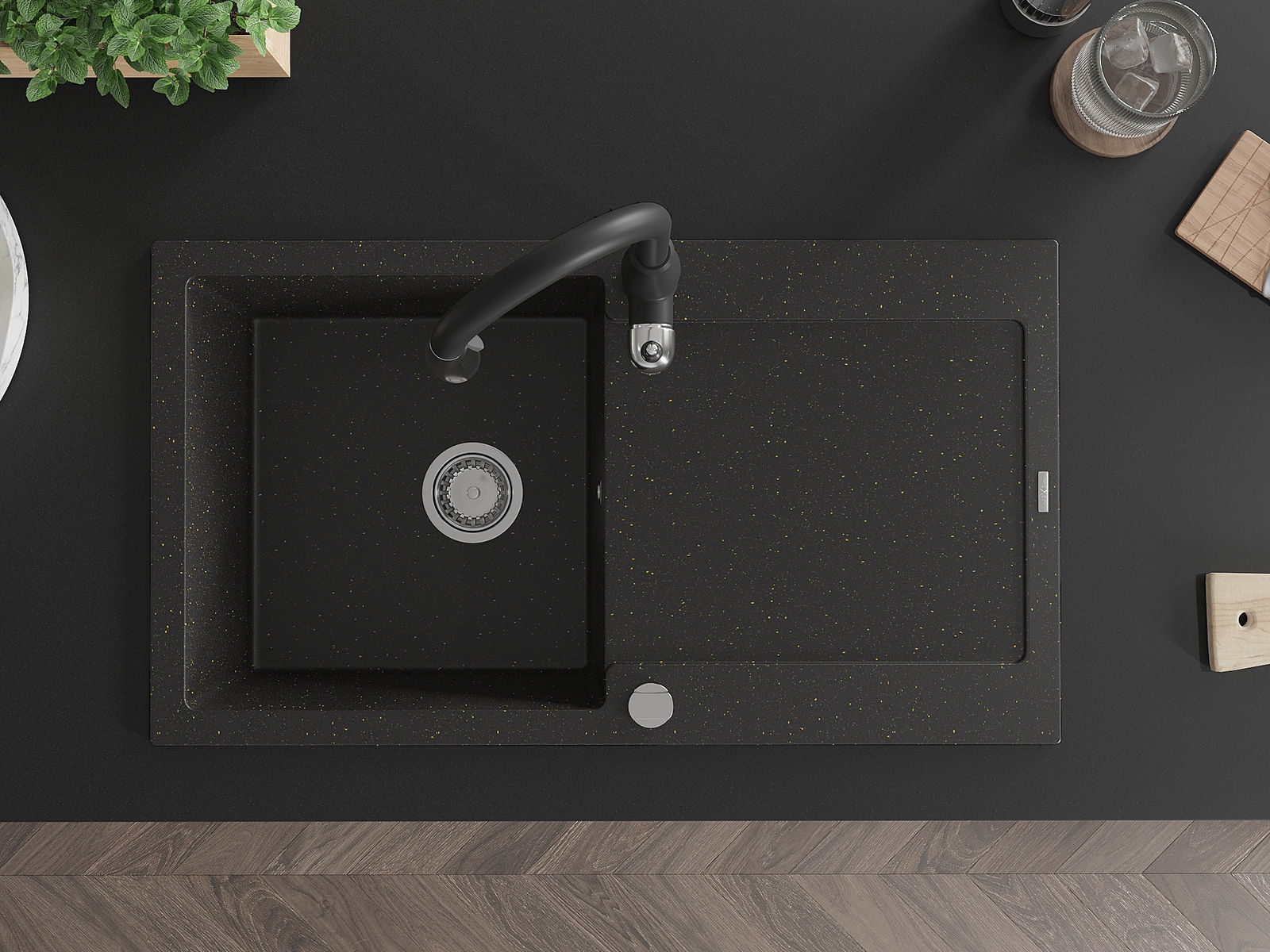 Mexen Leo évier en granit 1 bac avec égouttoir et robinet de cuisine Savita, noir/doré métallique - 6501-75-672601-70