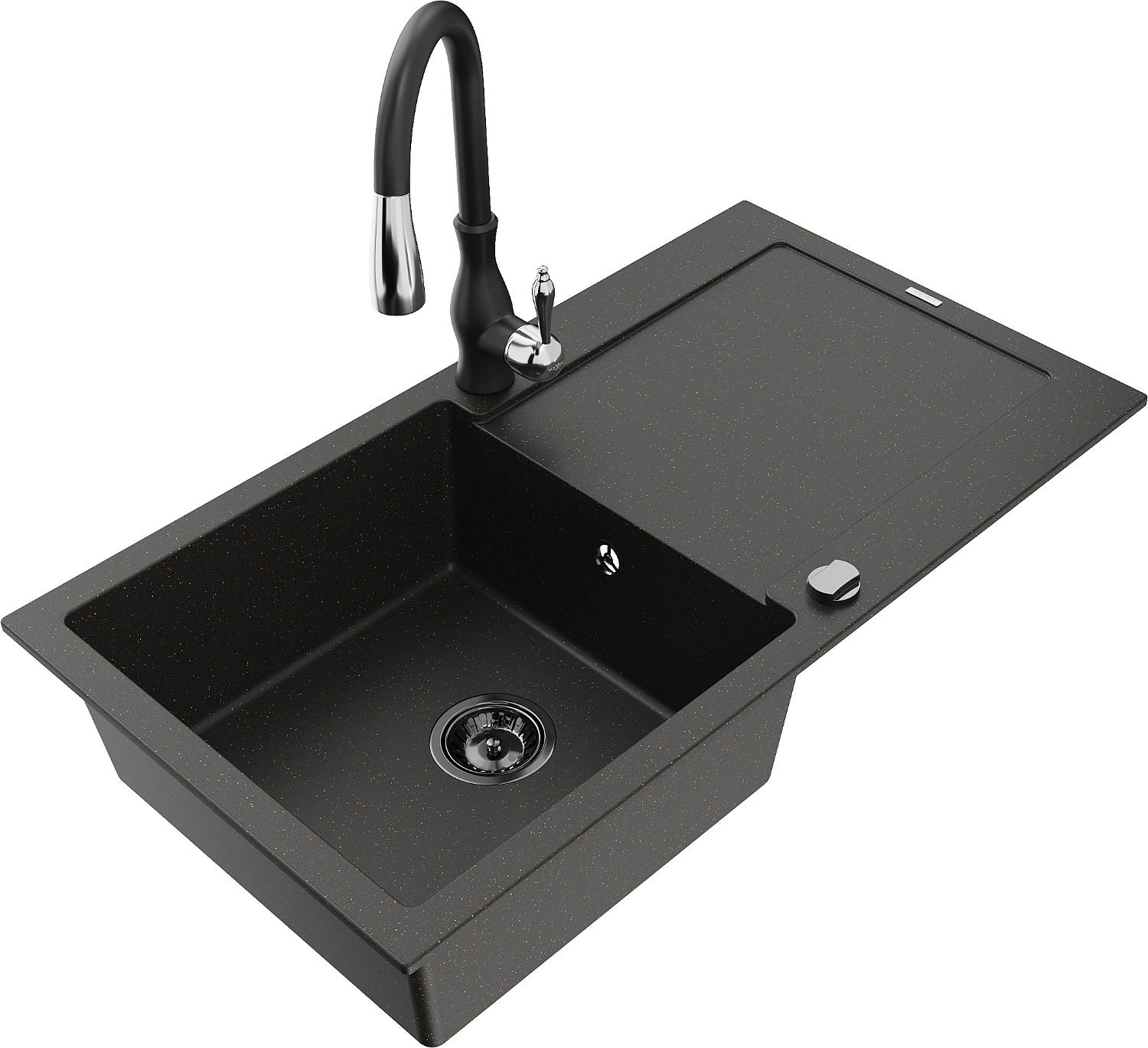 Mexen Leo évier granitique 1 bac avec égouttoir et robinet de cuisine Savita, noir/or métallique - 6501-75-672601-70-B