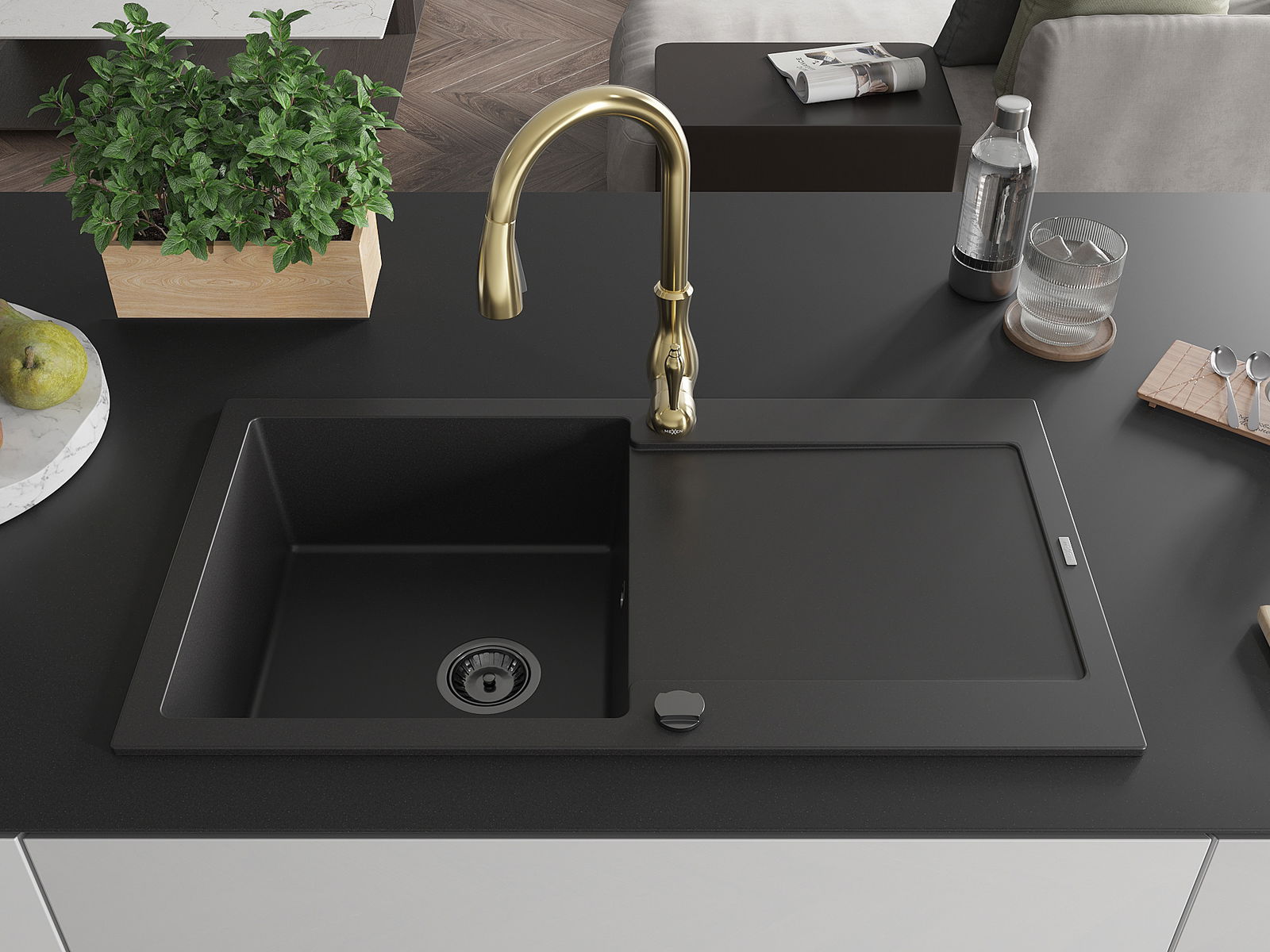 Mexen Leo évier en granit à 1 bac avec égouttoir et robinet de cuisine Savita, noir - 6501-77-672601-50-B
