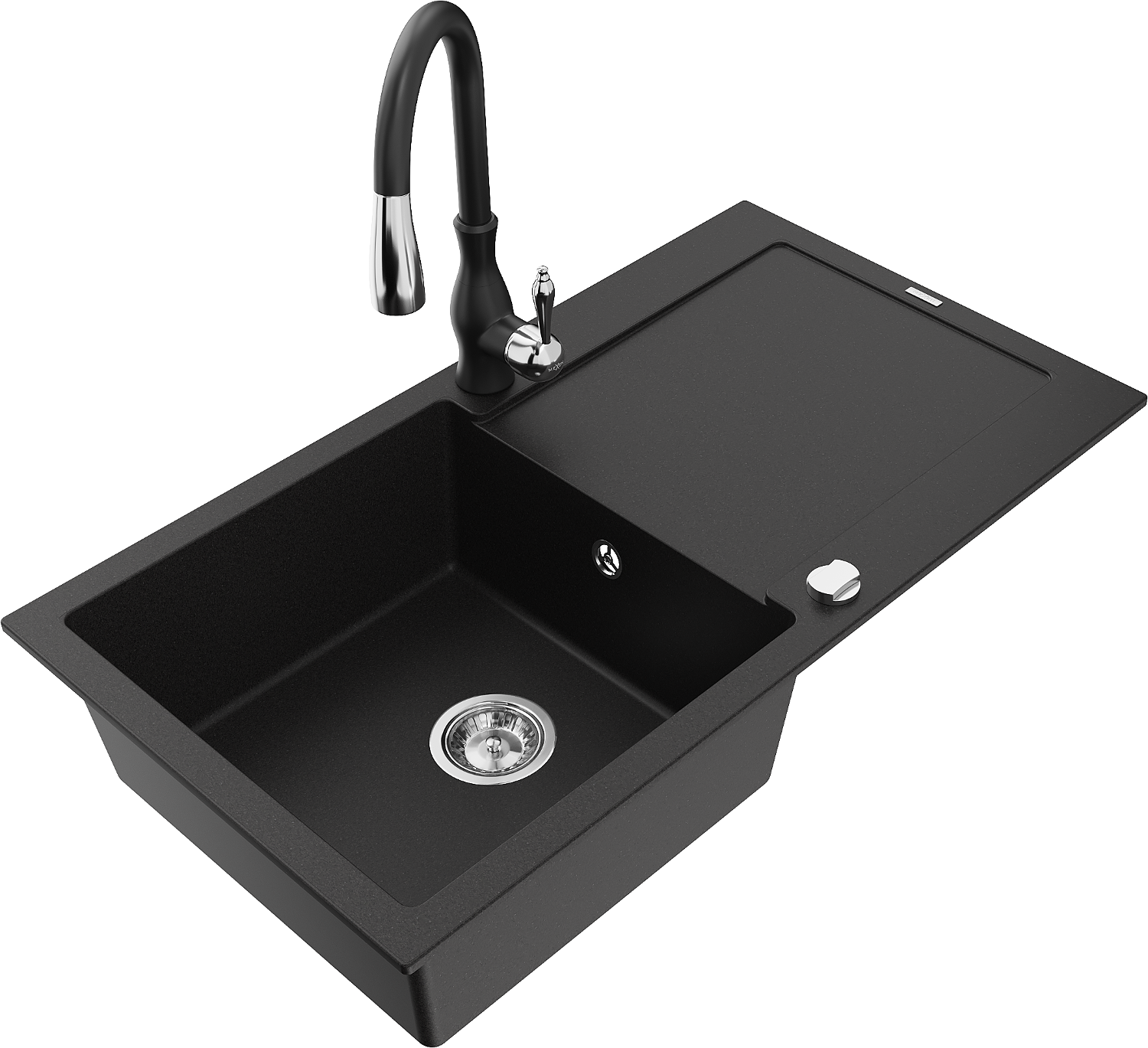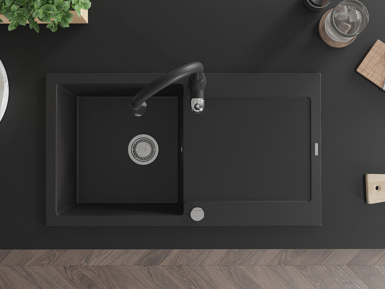 Mexen Leo évier en granit à 1 bac avec égouttoir et robinet de cuisine Savita, noir - 6501-77-672601-70