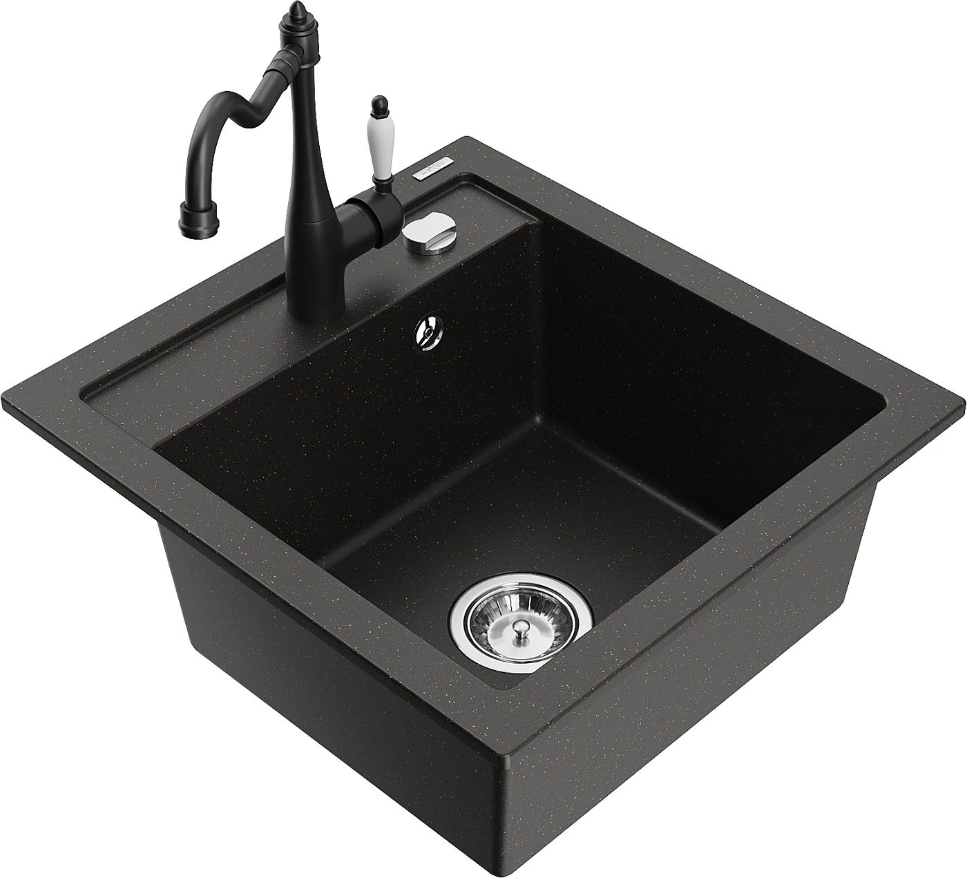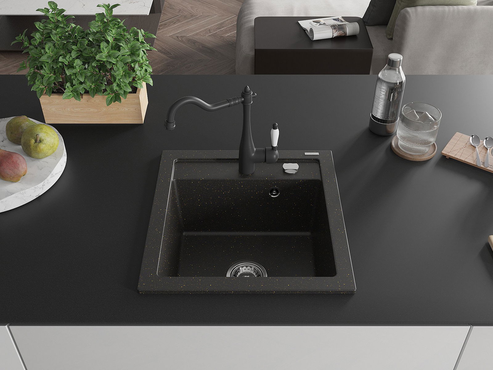 Mexen Vito évier en granit 1 bac avec robinet de cuisine Carla, noir/doré métallisé - 6503-75-670700-70