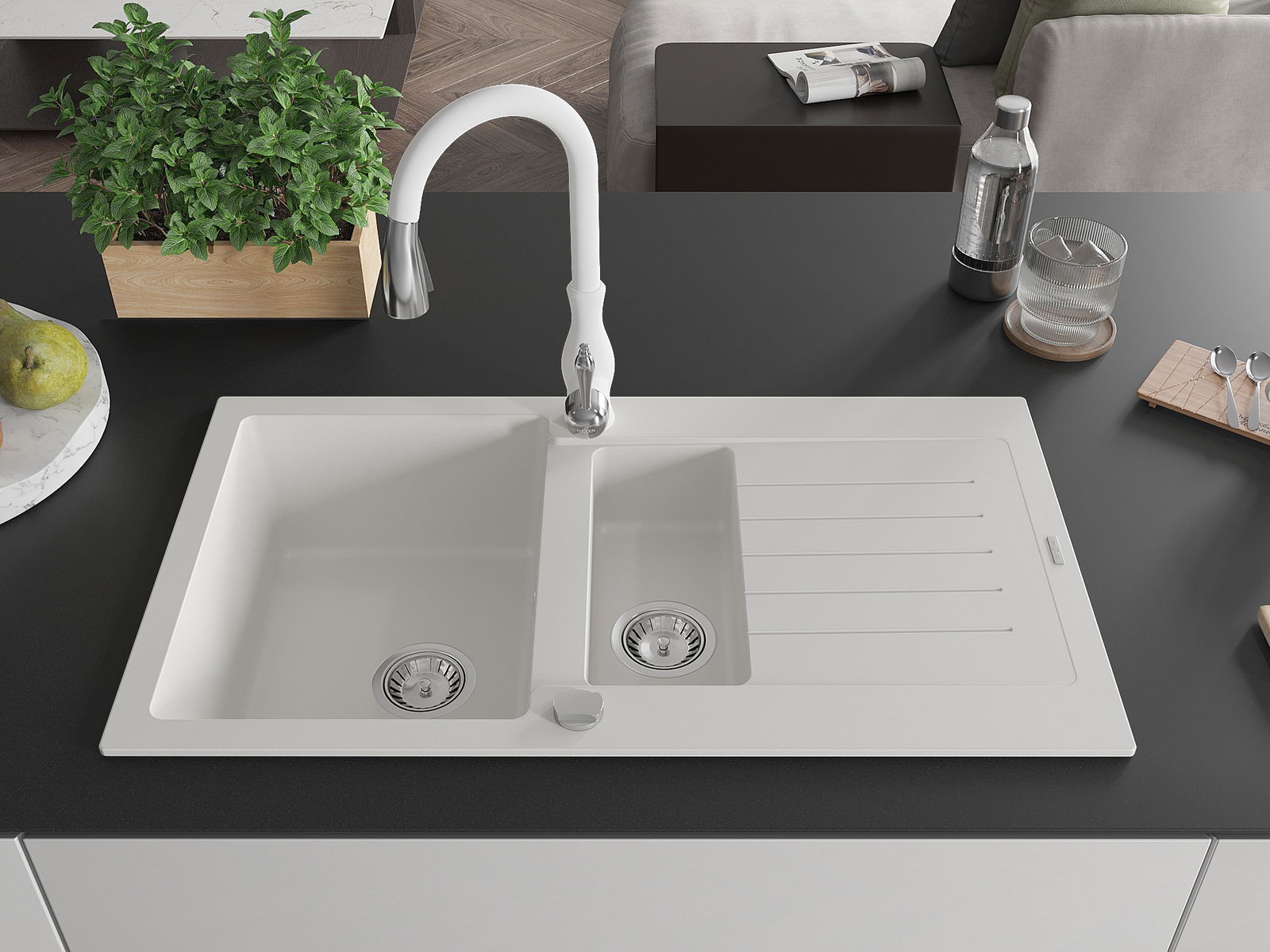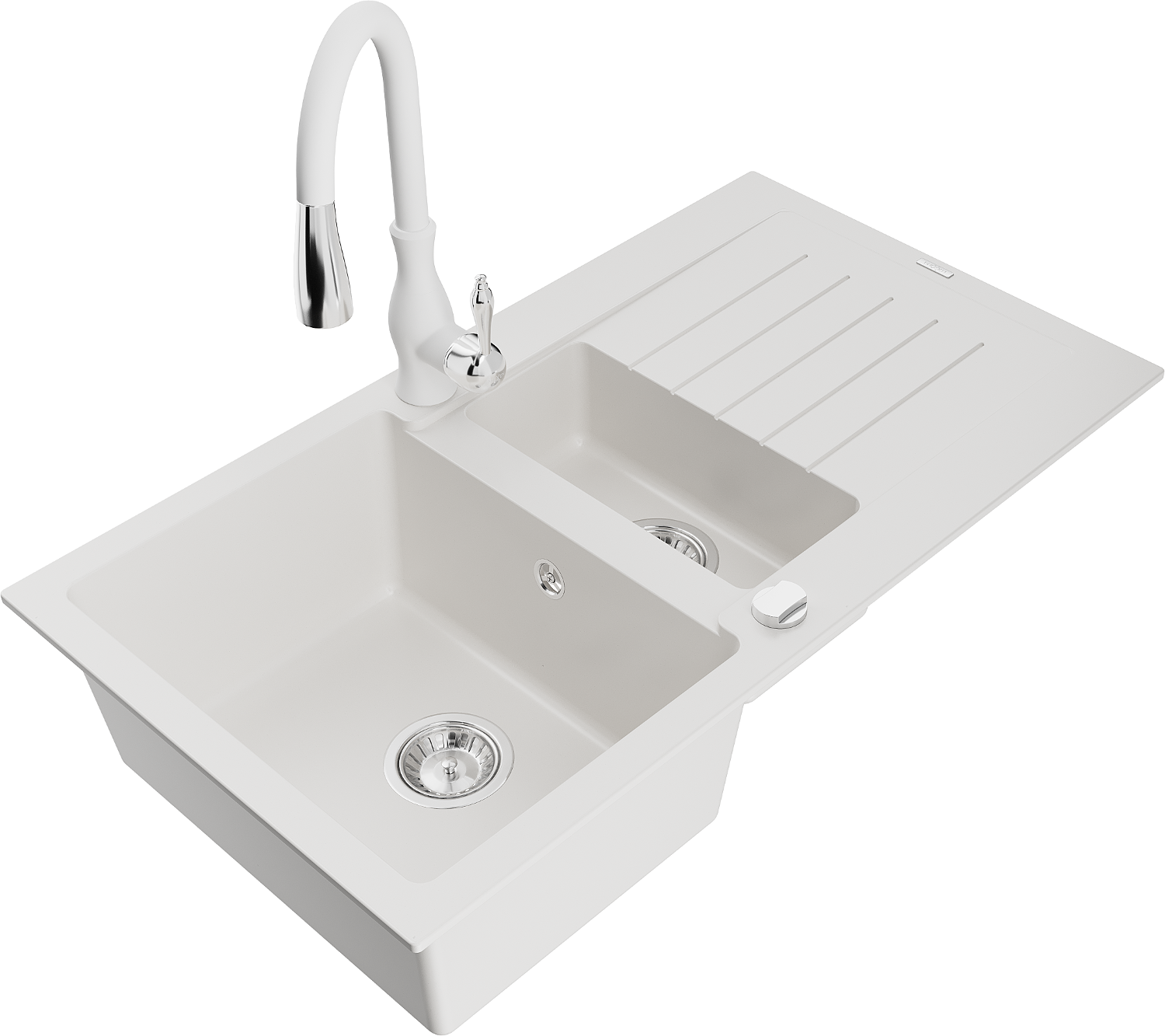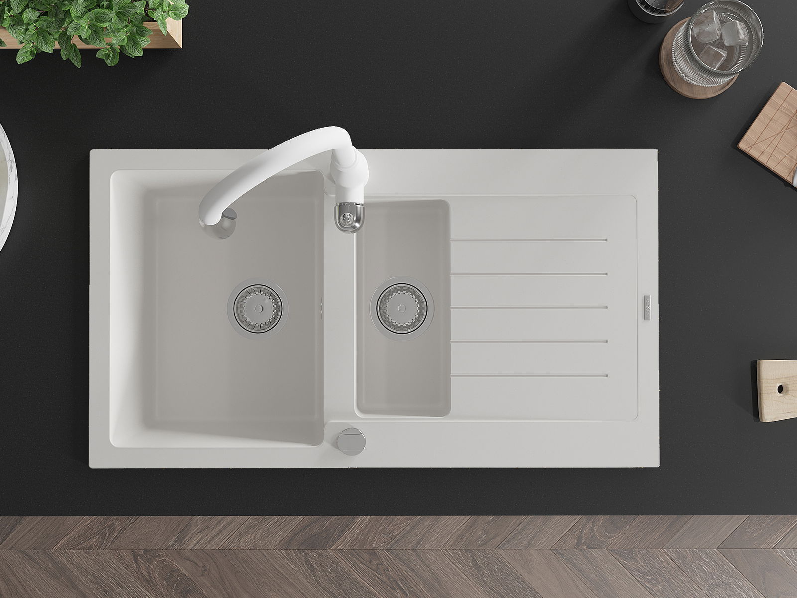 Mexen Matias évier en granit 1,5 bac avec égouttoir et robinet de cuisine Savita, blanc - 6502-20-672601-20