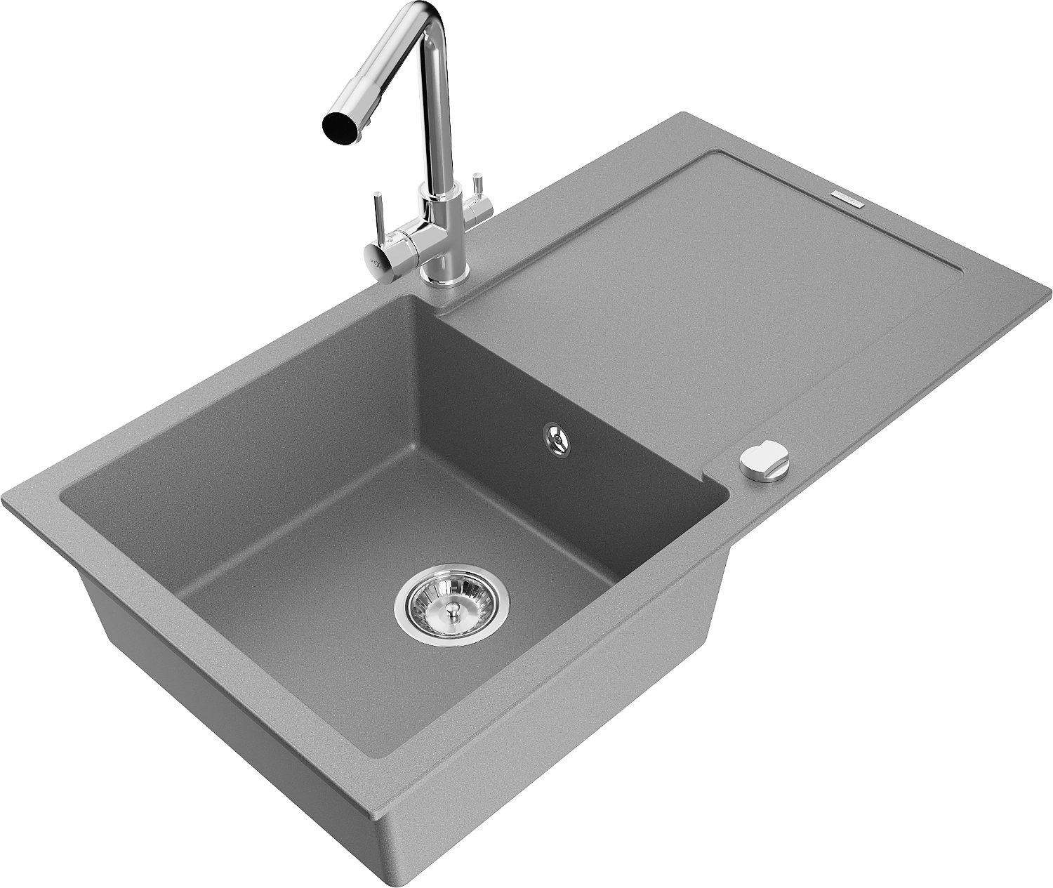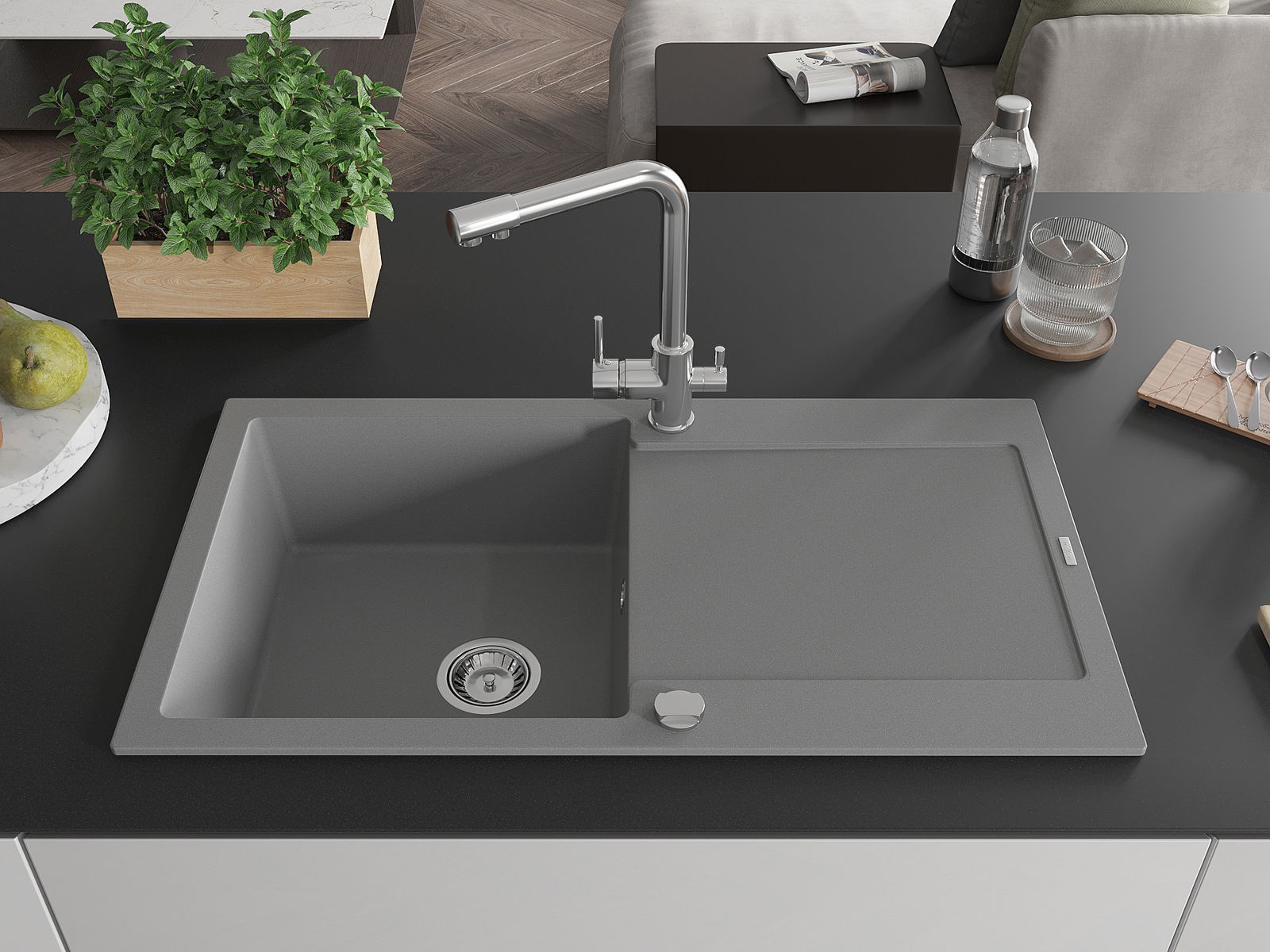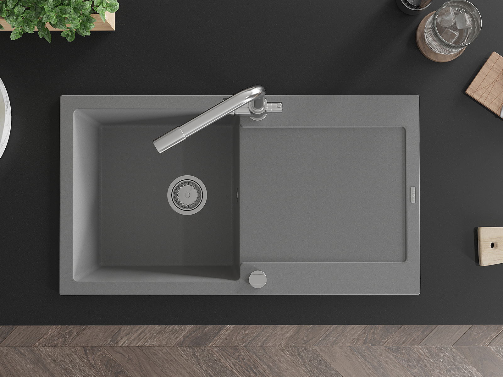 Mexen Leo évier de cuisine en granit 1-bassin avec égouttoir et mitigeur de cuisine Duero, gris - 6501-71-671600-00