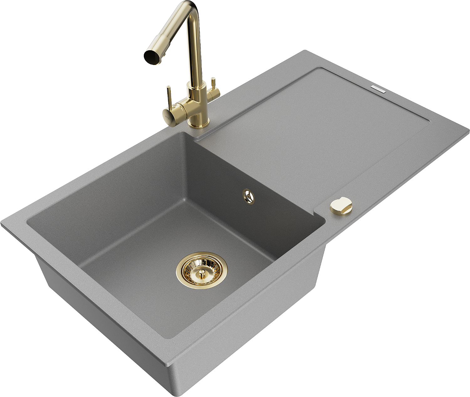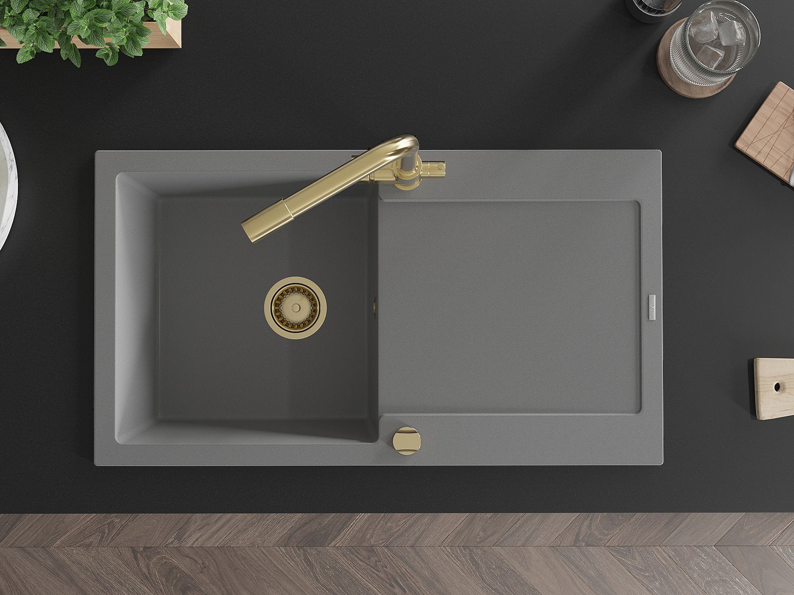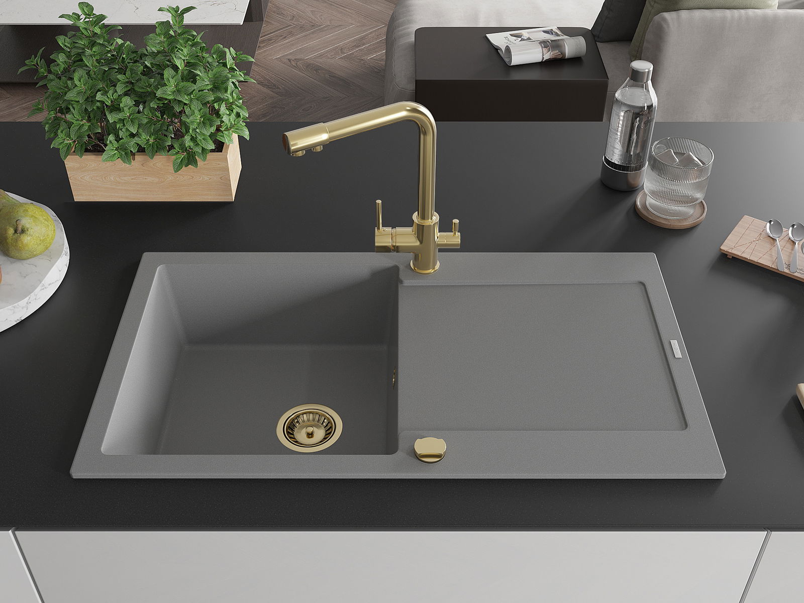 Mexen Leo évier de cuisine en granit 1 bac avec égouttoir et robinet de cuisine Duero, gris - 6501-71-671600-50