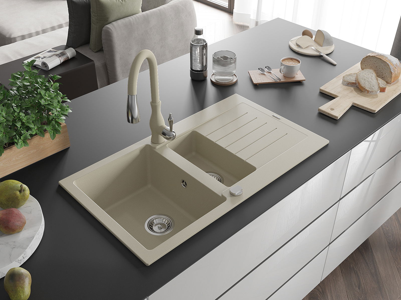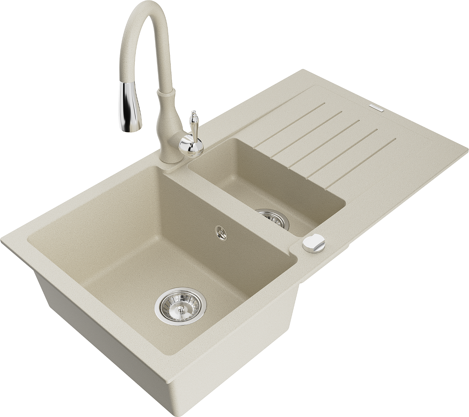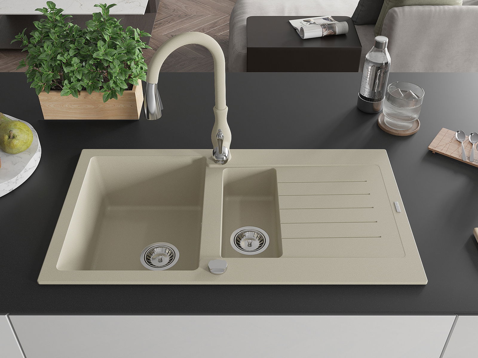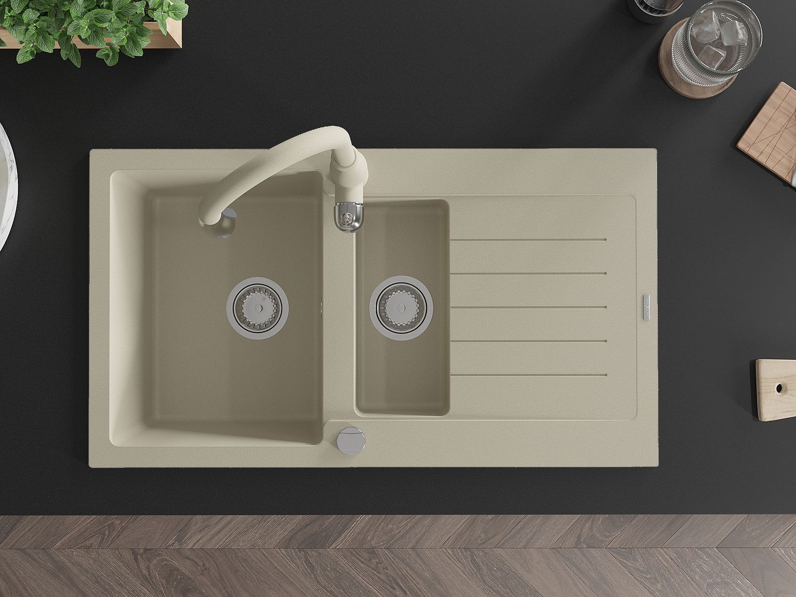 Mexen Matias évier en granit 1,5 bac avec égouttoir et robinet de cuisine Savita, beige - 6502-69-672601-69