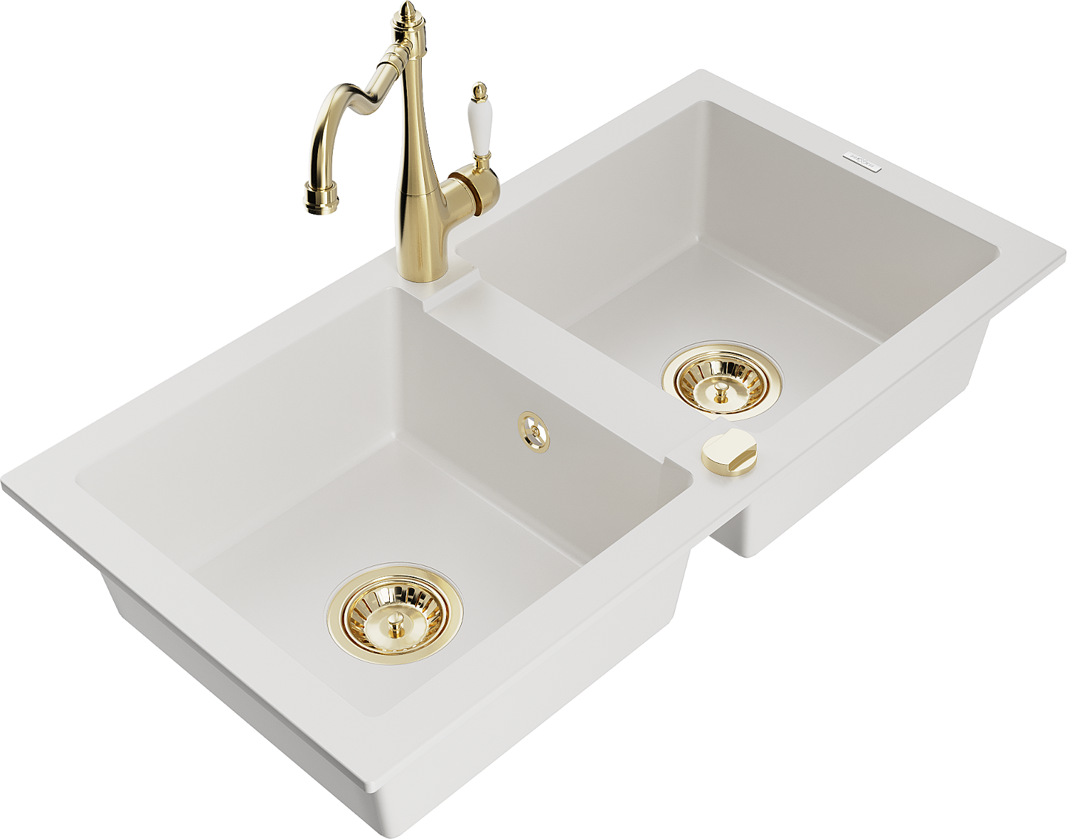 Mexen Mario évier en granit à 2 cuves avec robinet de cuisine Carla, blanc - 6504-20-670700-50