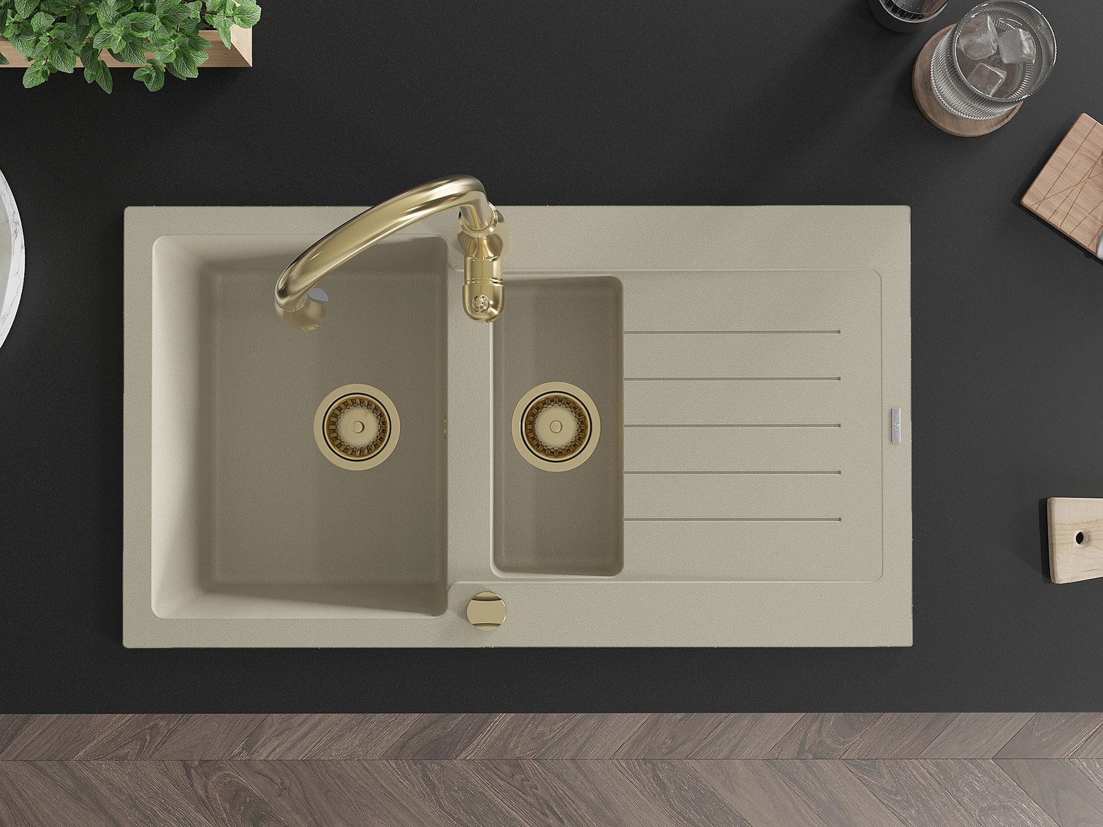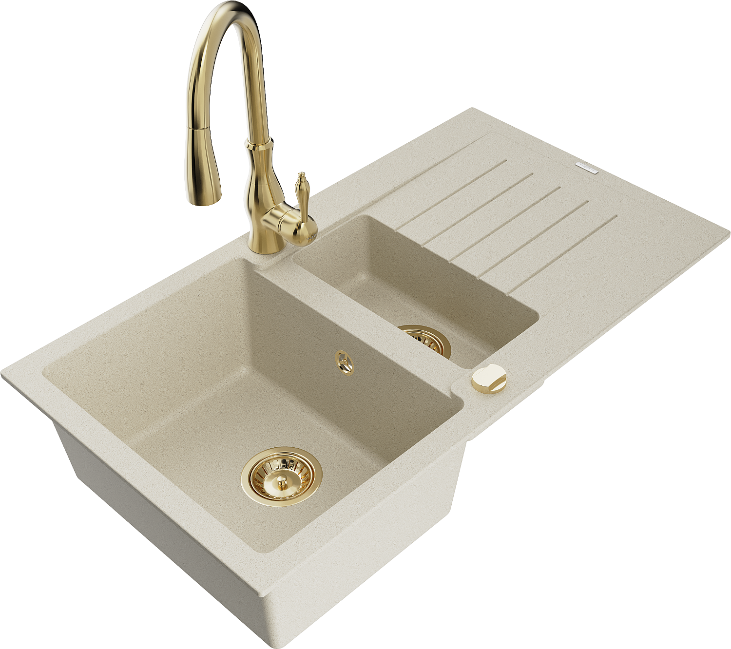 Mexen Matias évier en granit 1,5 bac avec égouttoir et mitigeur de cuisine Savita, beige - 6502-69-672601-50