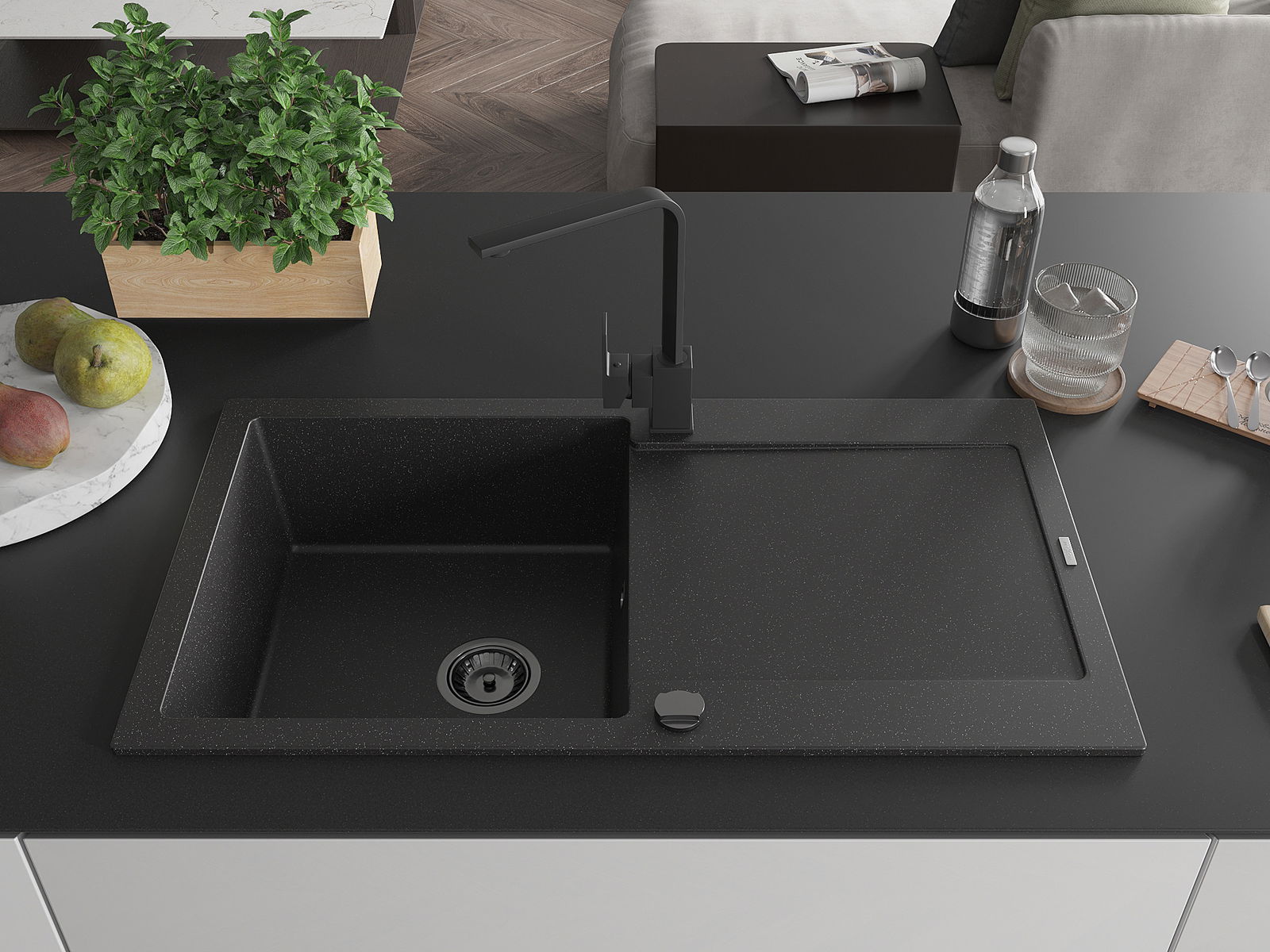 Mexen Leo évier en granit 1 bac avec égouttoir et robinet de cuisine Rita, noir/argent métallisé - 6501-73-670300-70-B