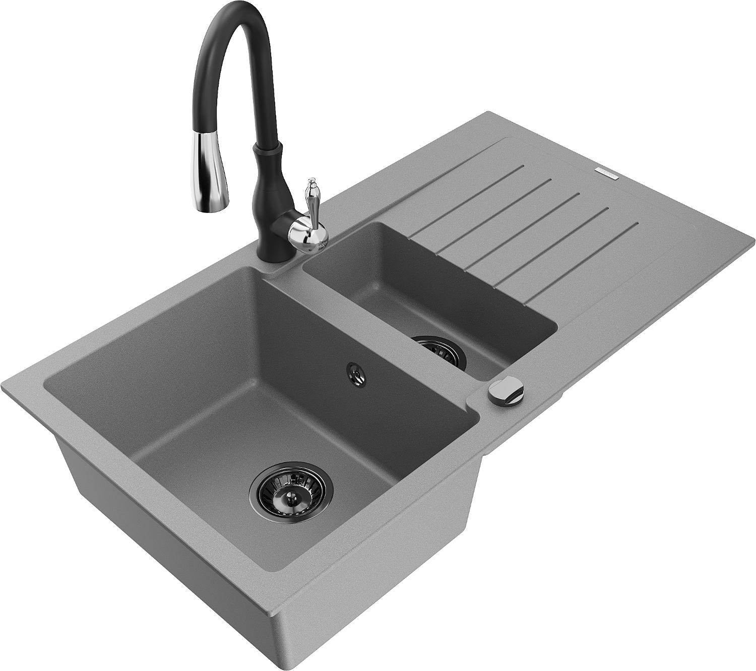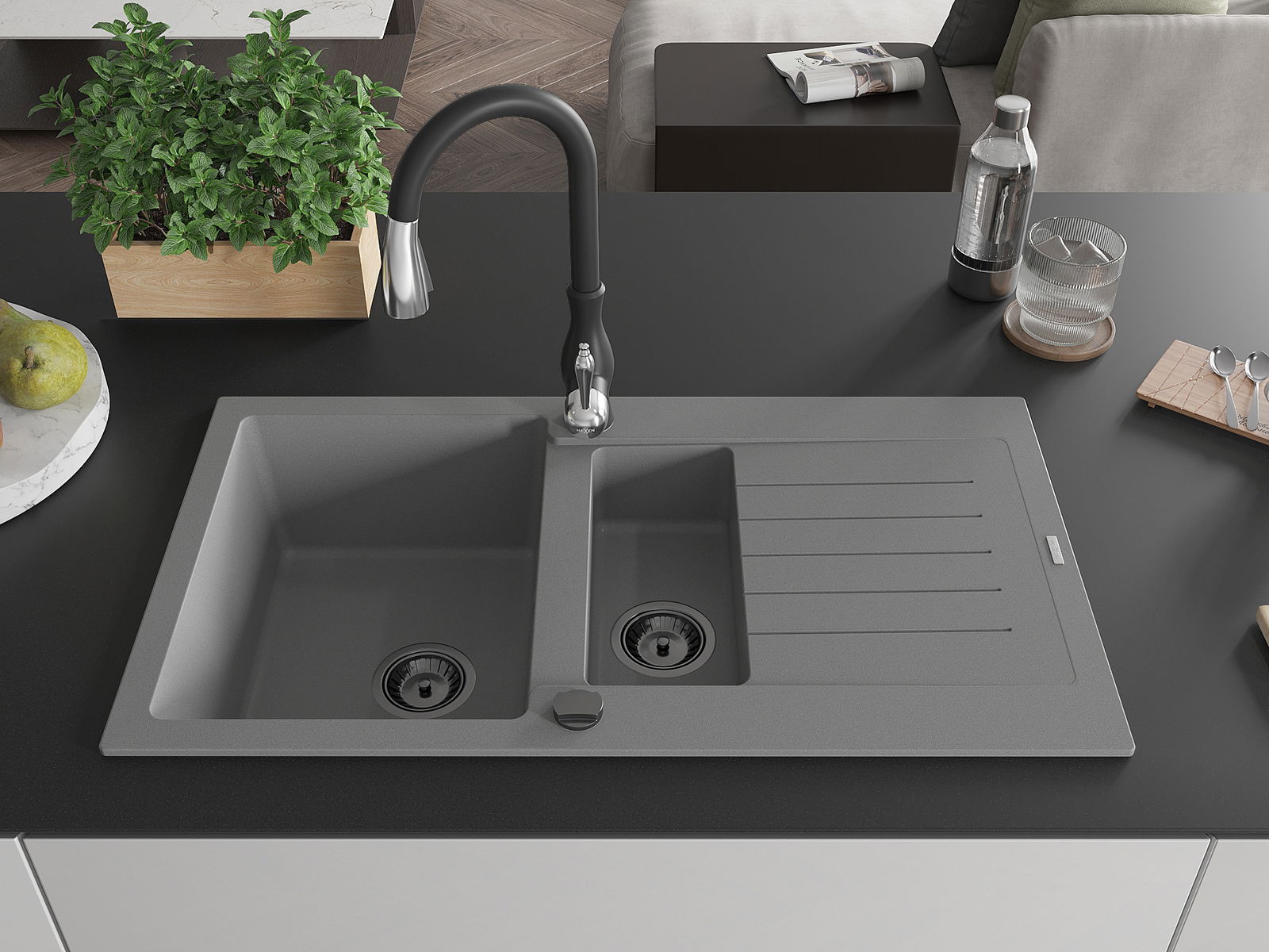 Mexen Matias évier de cuisine en granit 1,5 bac avec égouttoir et robinet de cuisine Savita, gris - 6502-71-672601-70-B