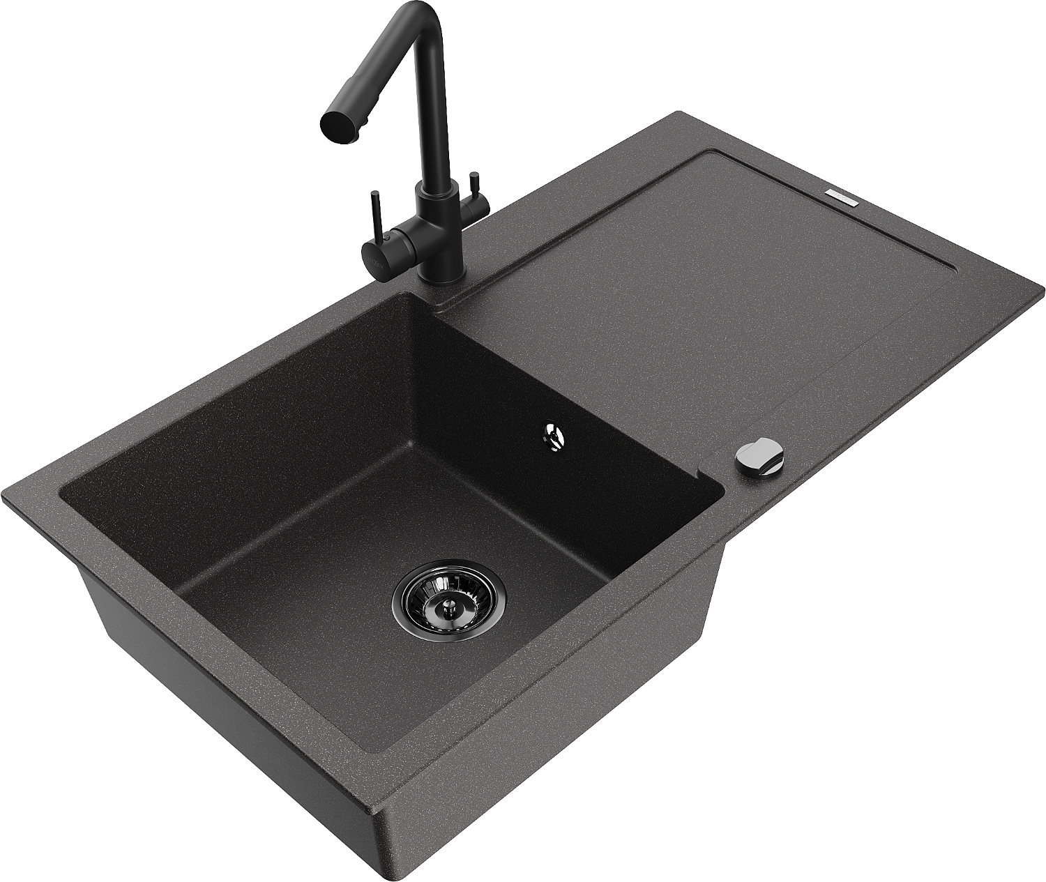 Mexen Leo évier en granit 1 bac avec égouttoir et robinet de cuisine Duero, noir moucheté - 6501-76-671600-70-B