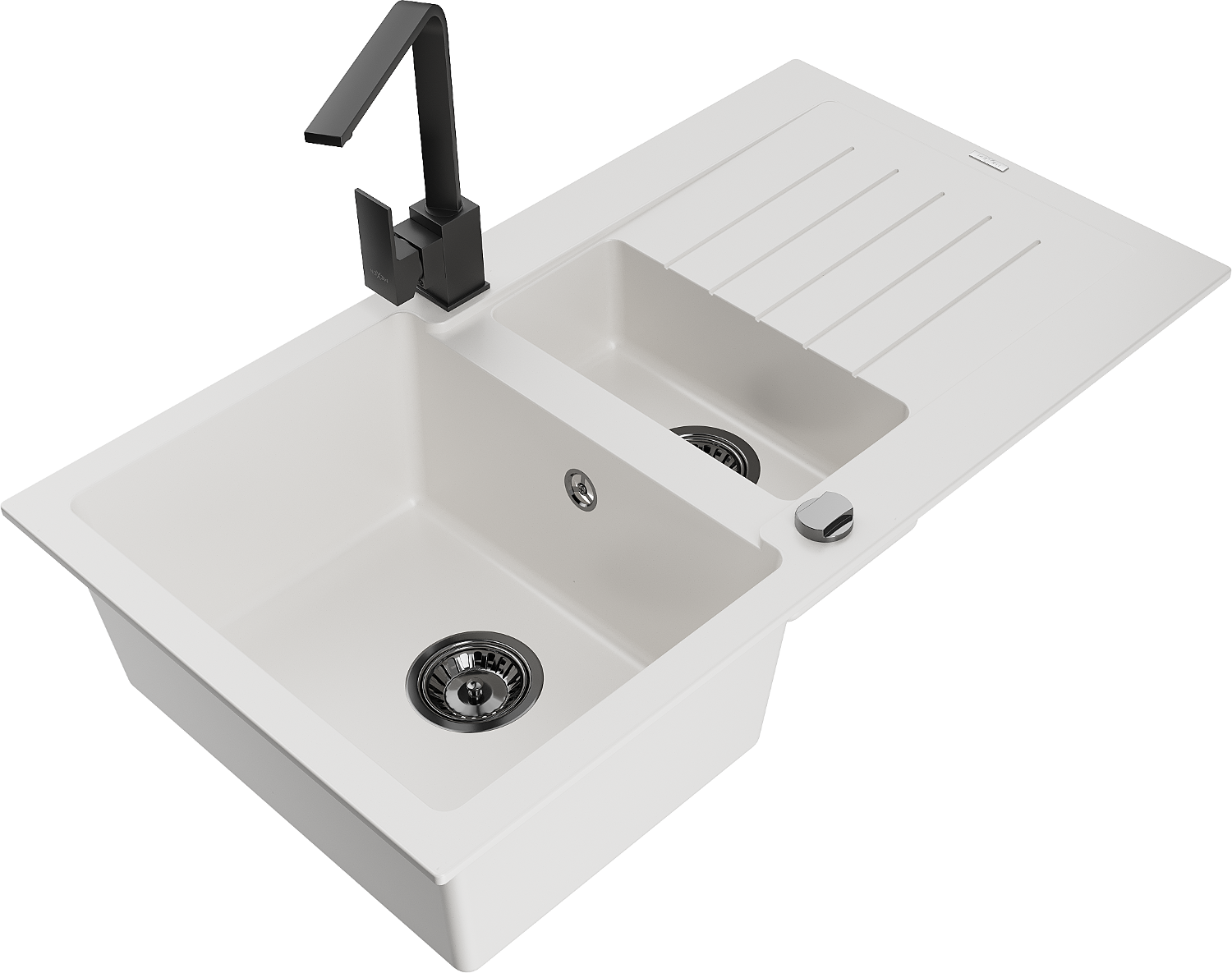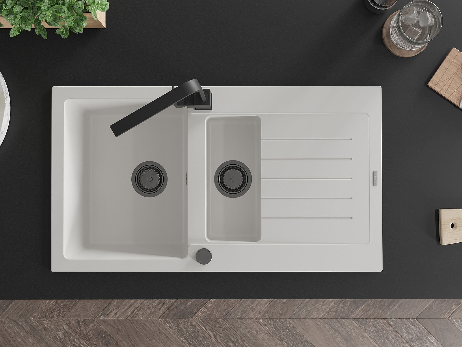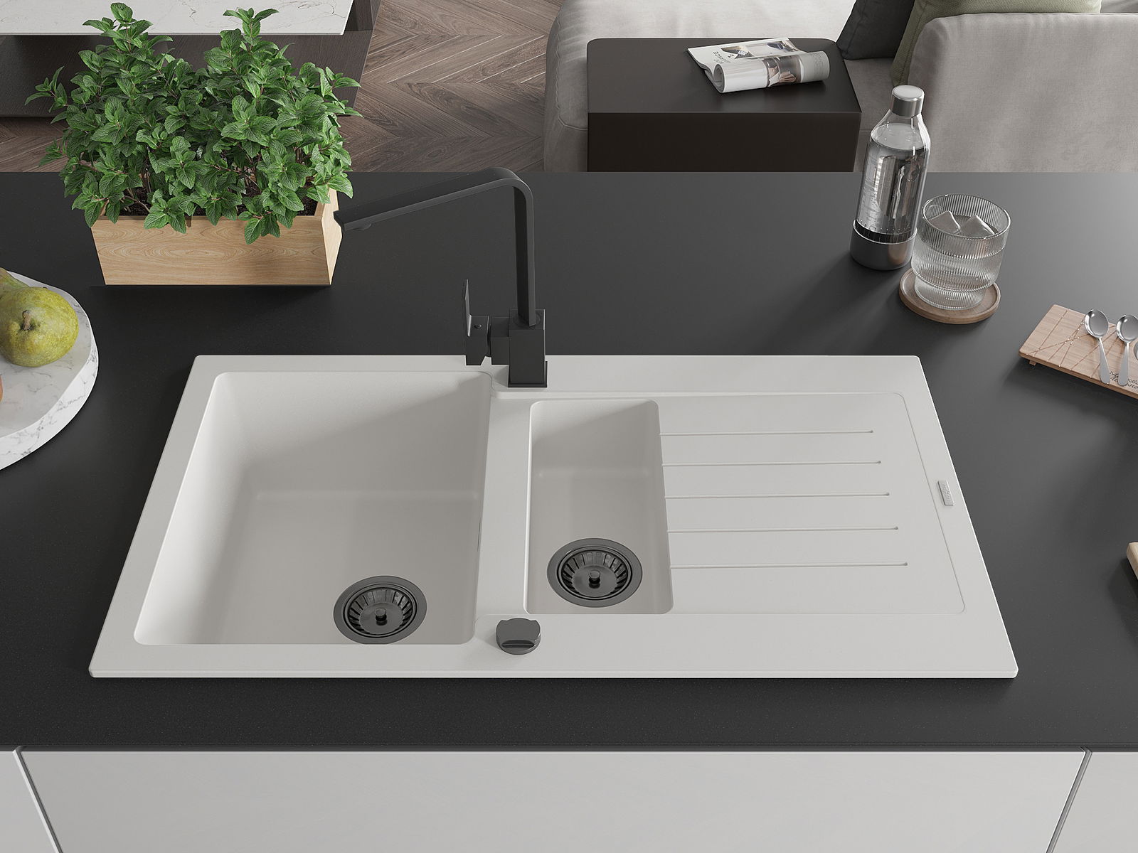 Mexen Matias évier en granit 1,5 bac avec égouttoir et mitigeur de cuisine Rita, blanc - 6502-20-670300-70