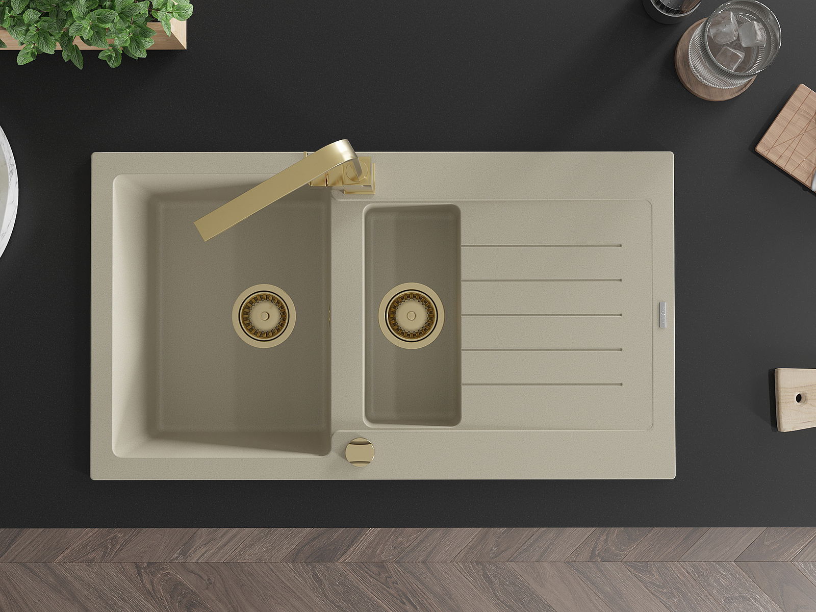 Mexen Matias évier en granit 1,5 bacs avec égouttoir et robinet de cuisine Rita, beige - 6502-69-670300-50
