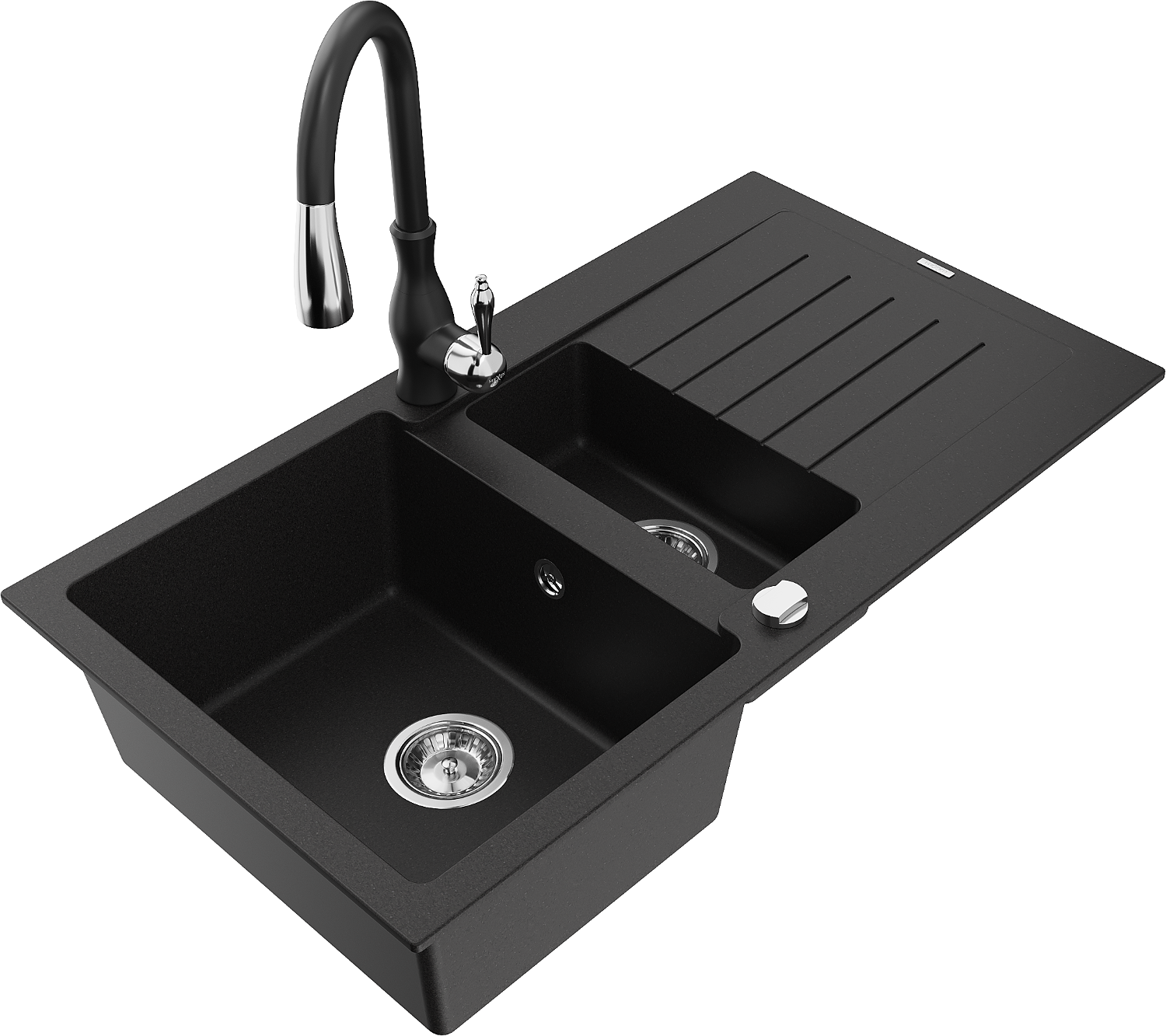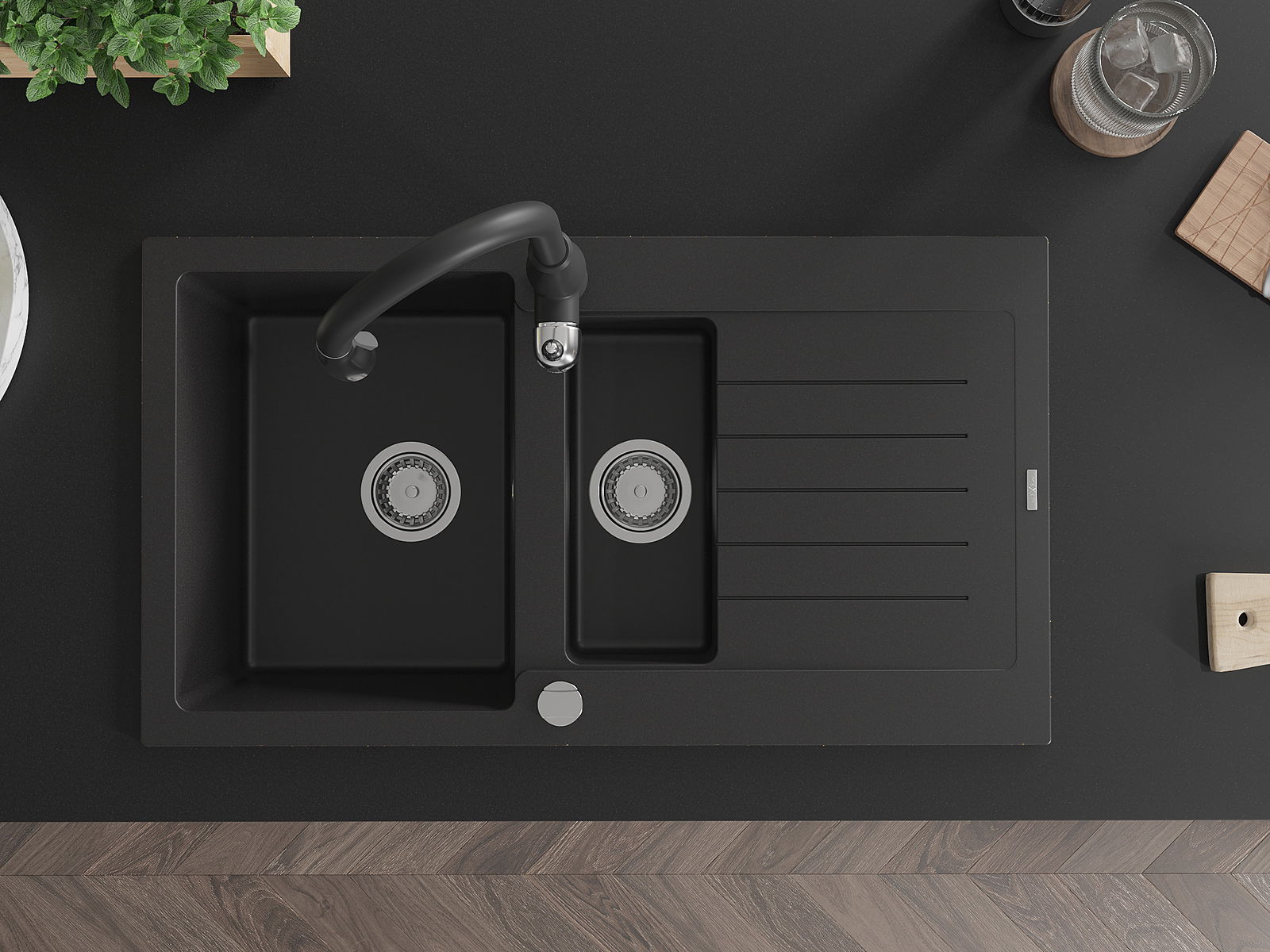 Mexen Matias évier en granit 1,5 bac avec égouttoir et robinet de cuisine Savita, noir - 6502-77-672601-70