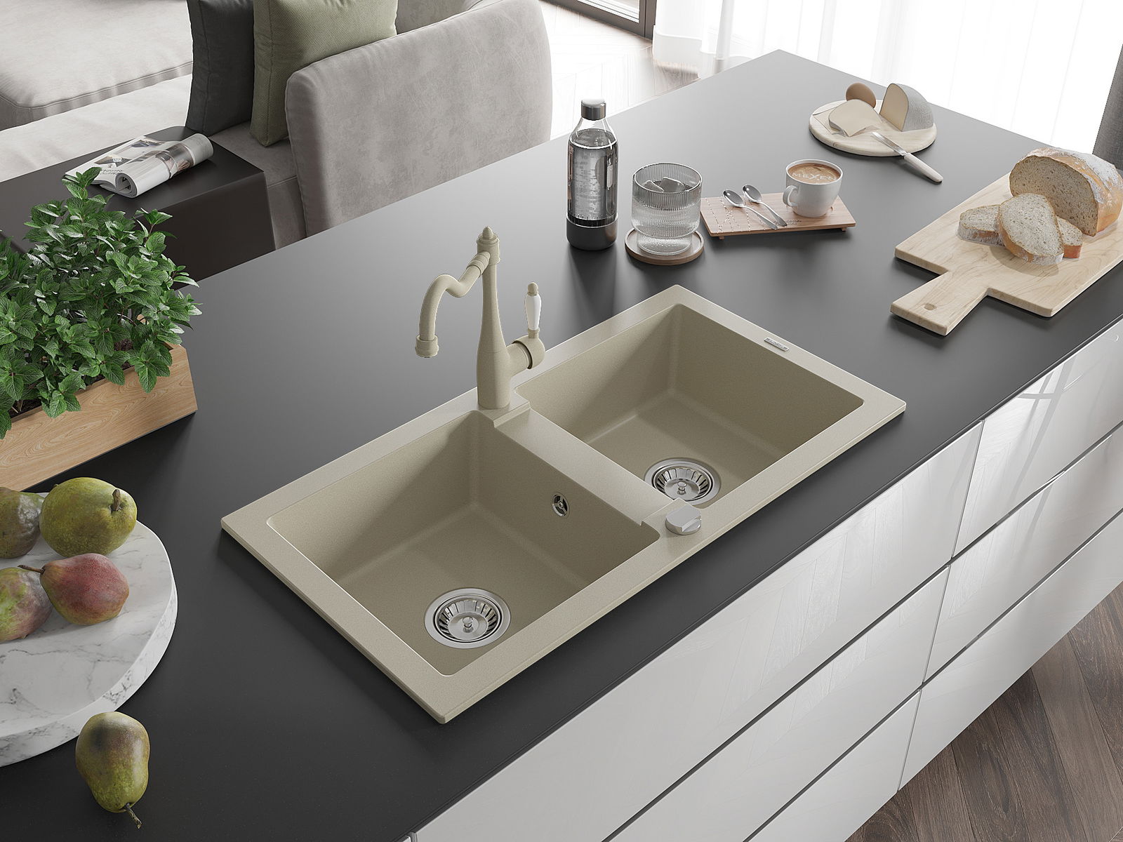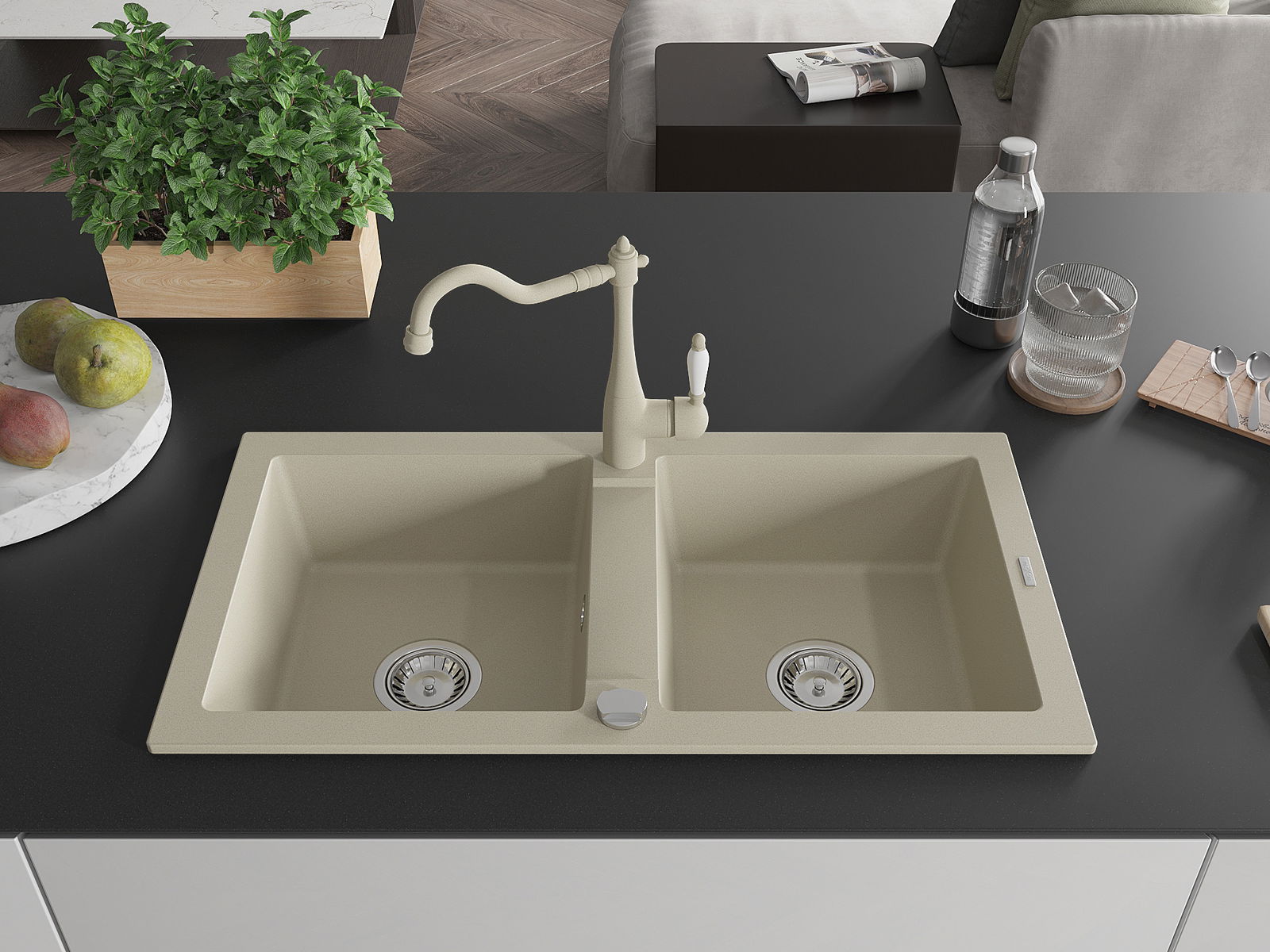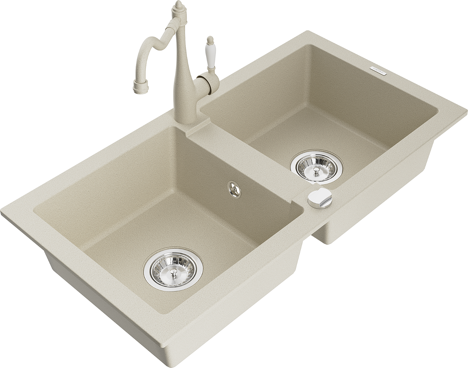 Mexen Mario évier en granit à 2 bacs avec robinet de cuisine Carla, beige - 6504-69-670700-69