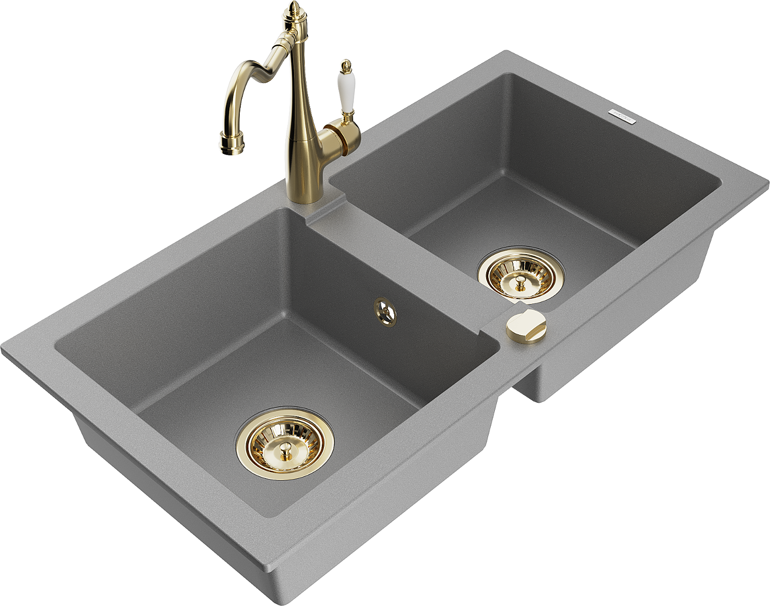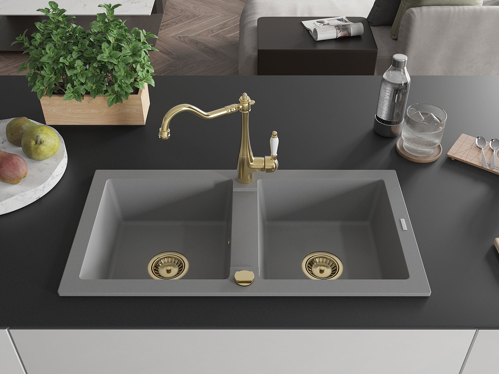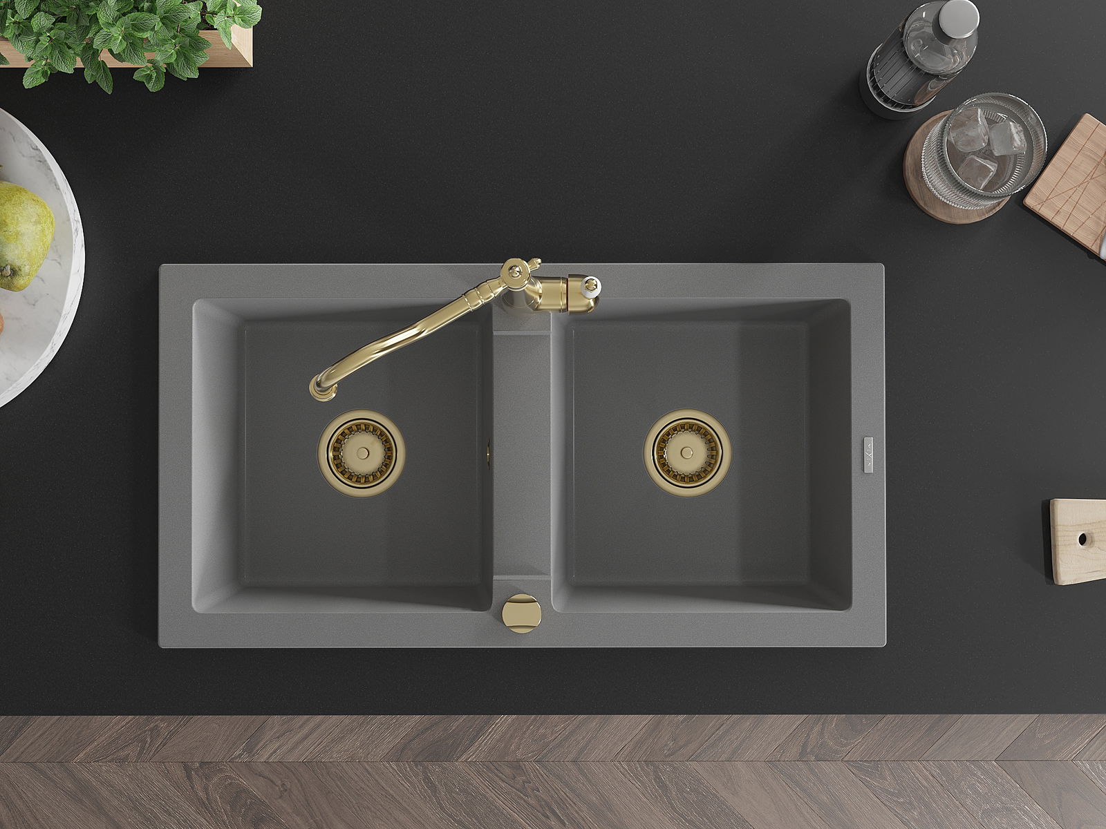 Mexen Mario évier en granit 2 bacs avec robinet de cuisine Carla, gris - 6504-71-670700-50