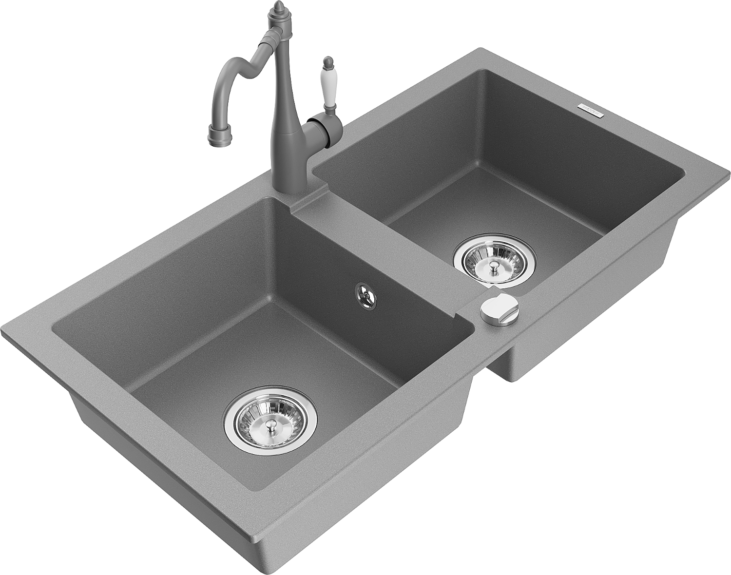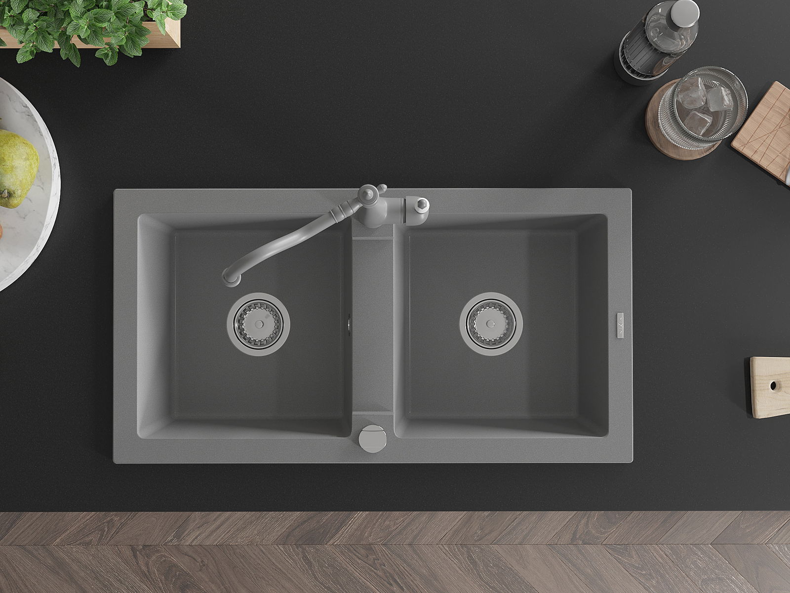 Mexen Mario évier en granit à 2 bacs avec robinet de cuisine Carla, gris - 6504-71-670700-71