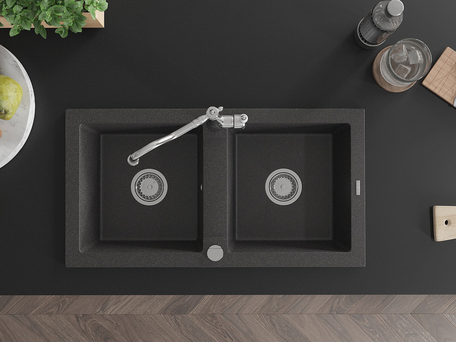 Mexen Mario évier en granit 2 bacs avec robinet de cuisine Carla, noir moucheté - 6504-76-670700-00