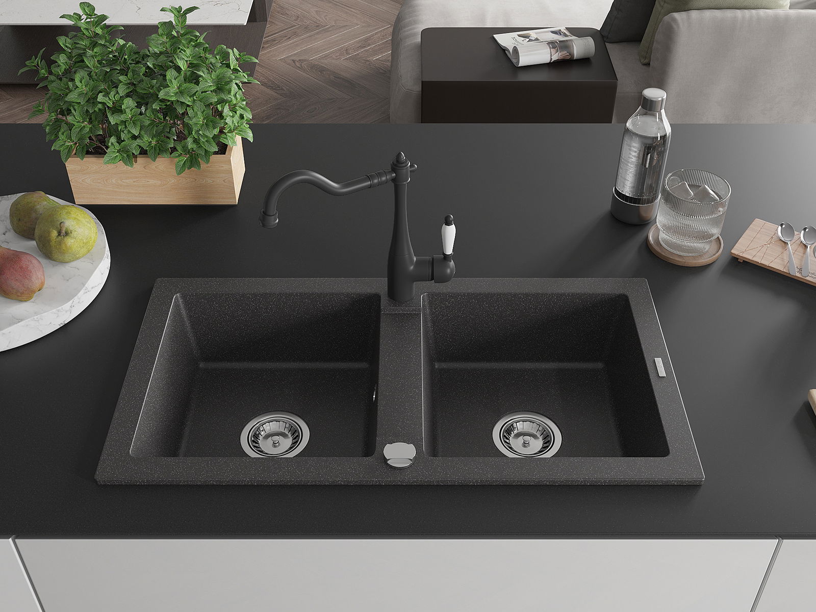 Mexen Mario évier en granit à 2 bacs avec mitigeur de cuisine Carla, noir moucheté - 6504-76-670700-70