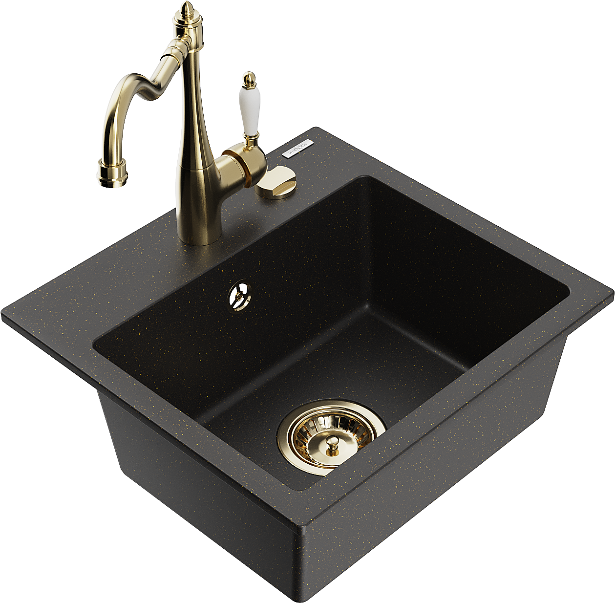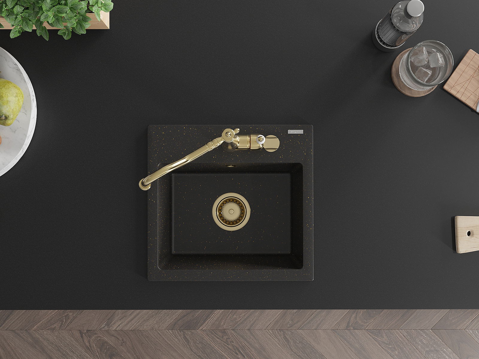 Mexen Milo évier en granit 1 bac avec robinet de cuisine Carla, noir/or métallique - 6505-75-670700-50