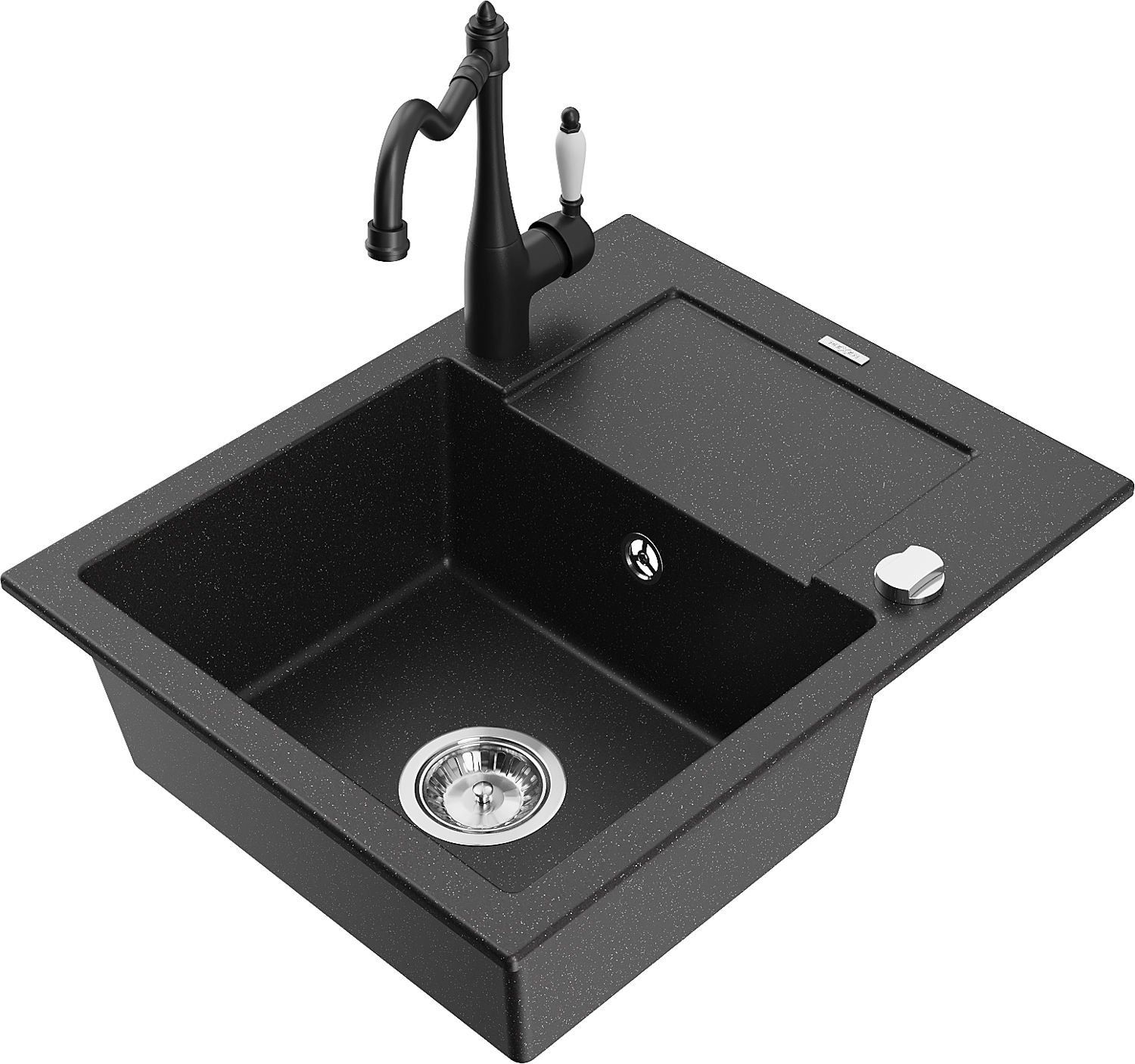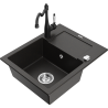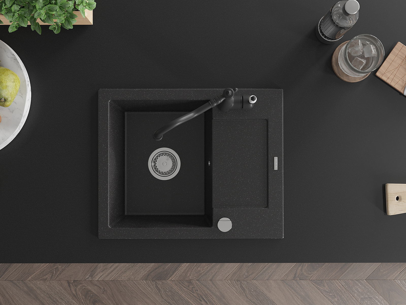 Mexen Enzo évier en granit 1 bac avec égouttoir et robinet de cuisine Carla, noir/métallic argenté - 6506-73-670700-70