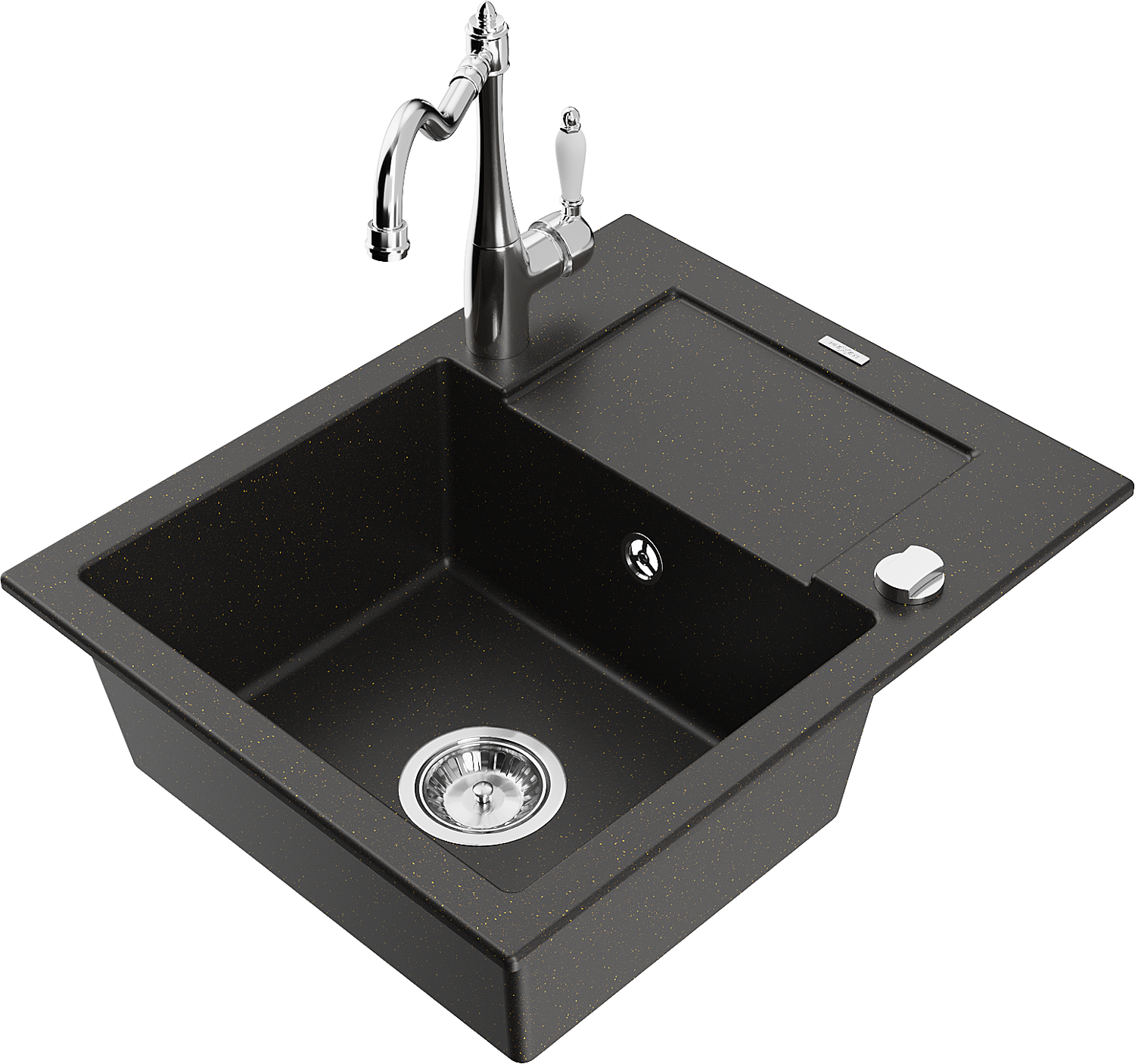 Mexen Enzo évier de cuisine en granit 1 bac avec égouttoir et robinet de cuisine Carla, noir/or métallique - 6506-75-670700-00